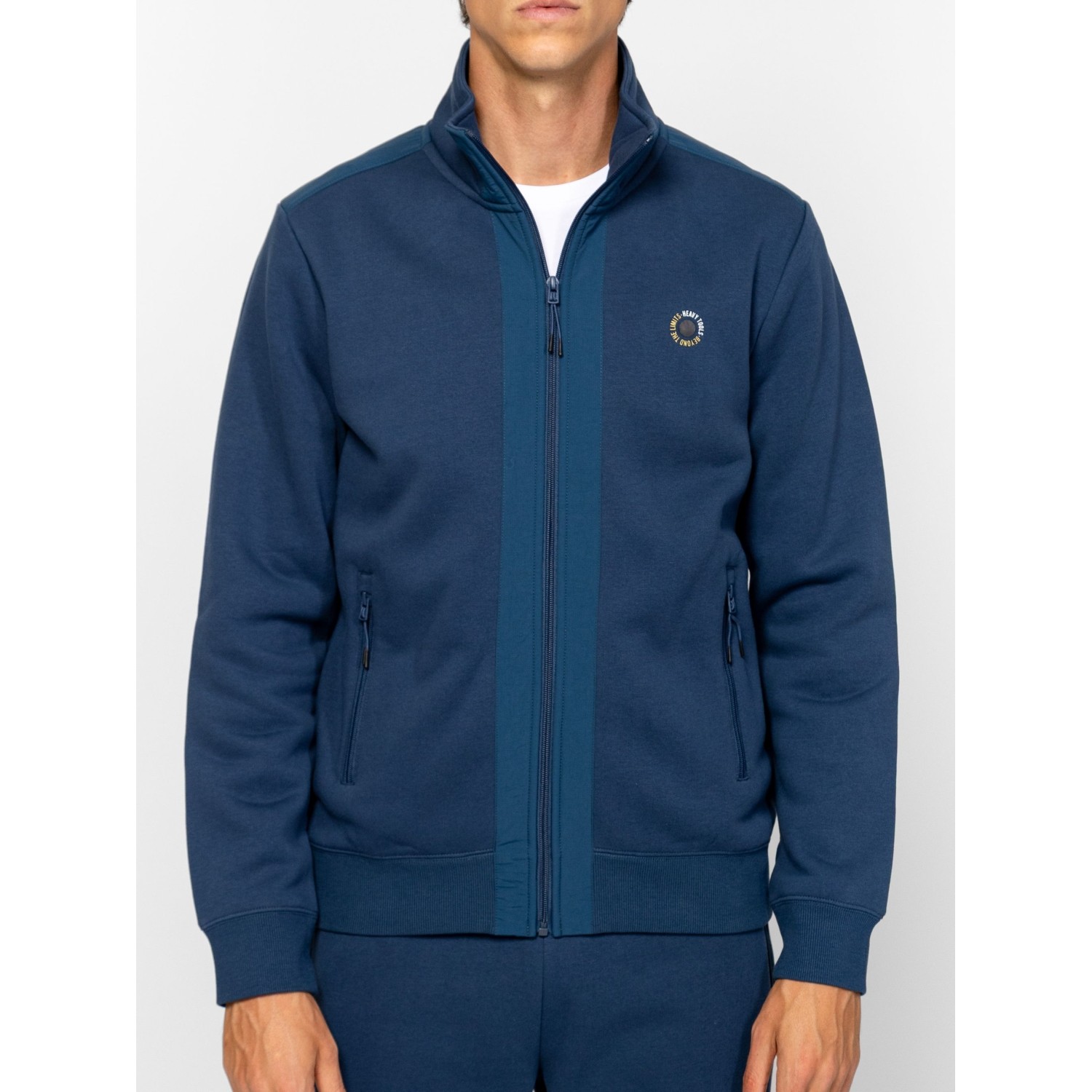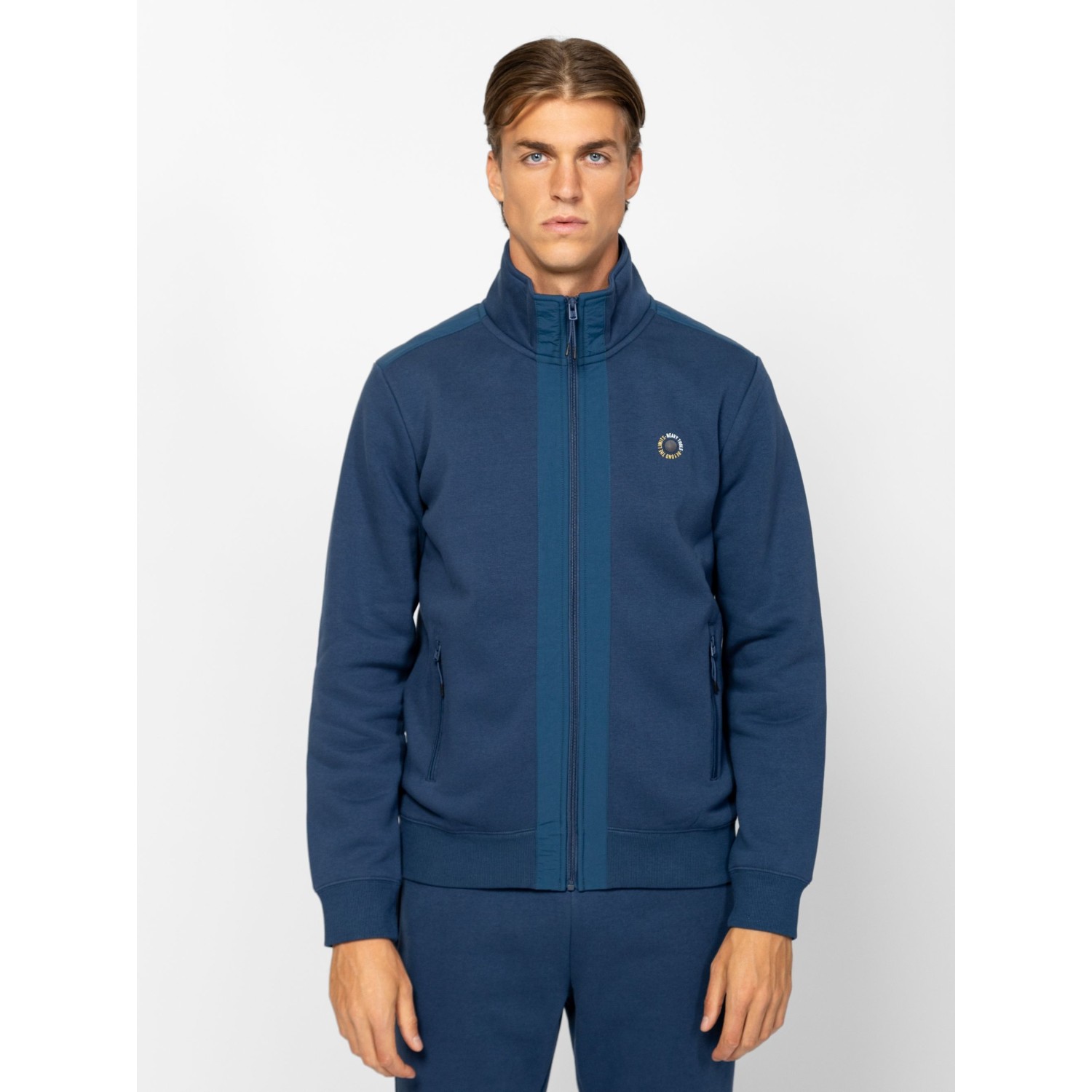 Férfi cipzáros, állógalléros pulóver, sportos megjelenéssel, többféle anyaggal, cipzáros zsebekkel, nyomott márkajelzéssel az elején, színes cipzárral. Viseld hozzá ZANDO melegítőnadrágunkat. Anyaga: 80% pamut, 20% poliészter, belül bolyhozott fleece, 100% poliamid, ripstop. A modell 188 cm magas és L-es méretet visel.