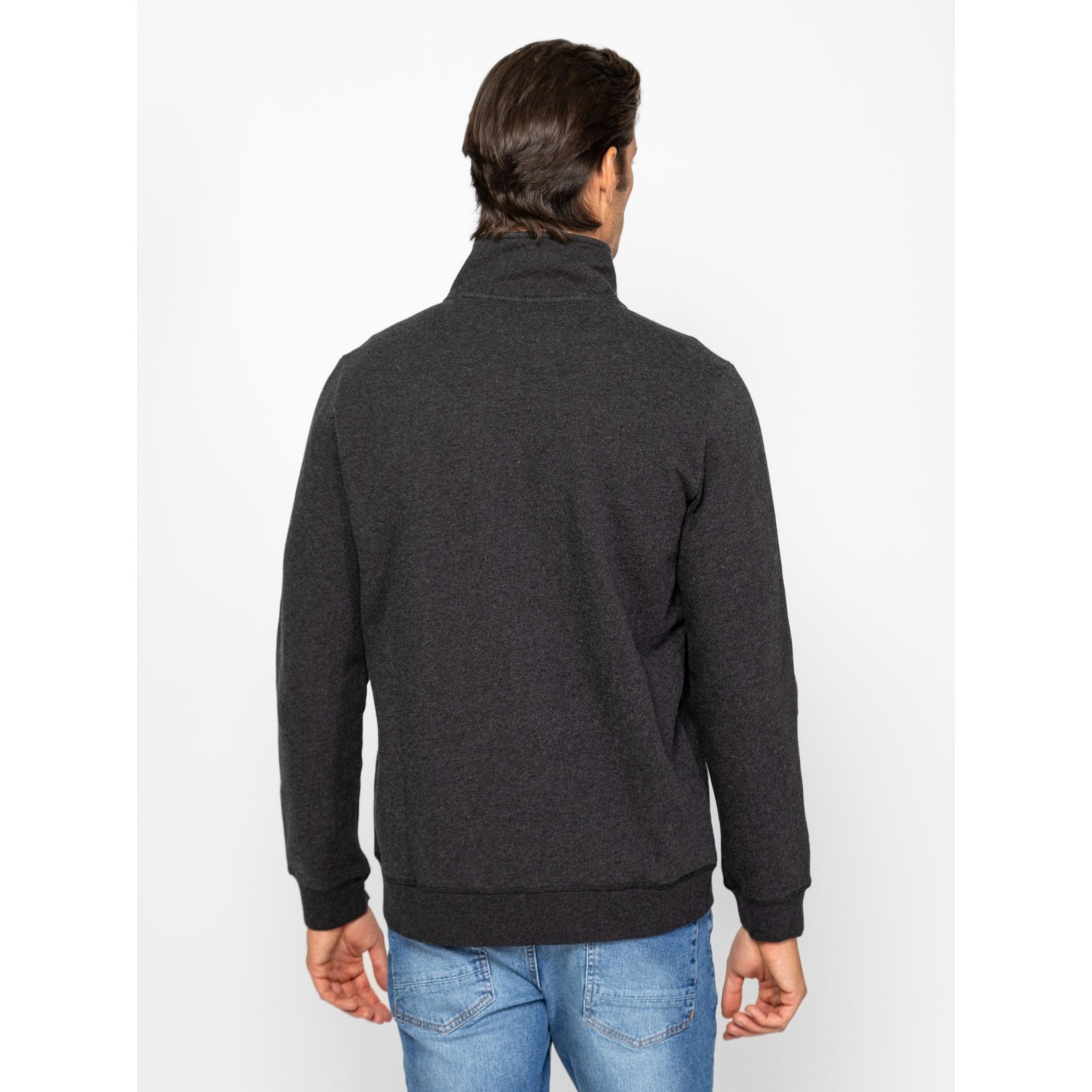 Férfi cipzáros, állógalléros pulóver, klasszikus szabással, egyenes zsebekkel, bordás passzés kézelővel és aljjal, elején hímzett márkajelzéssel. Anyaga: 57% pamut, 43% poliészter, belül bolyhozott fleece. A modell 188 cm magas és L-es méretet visel.