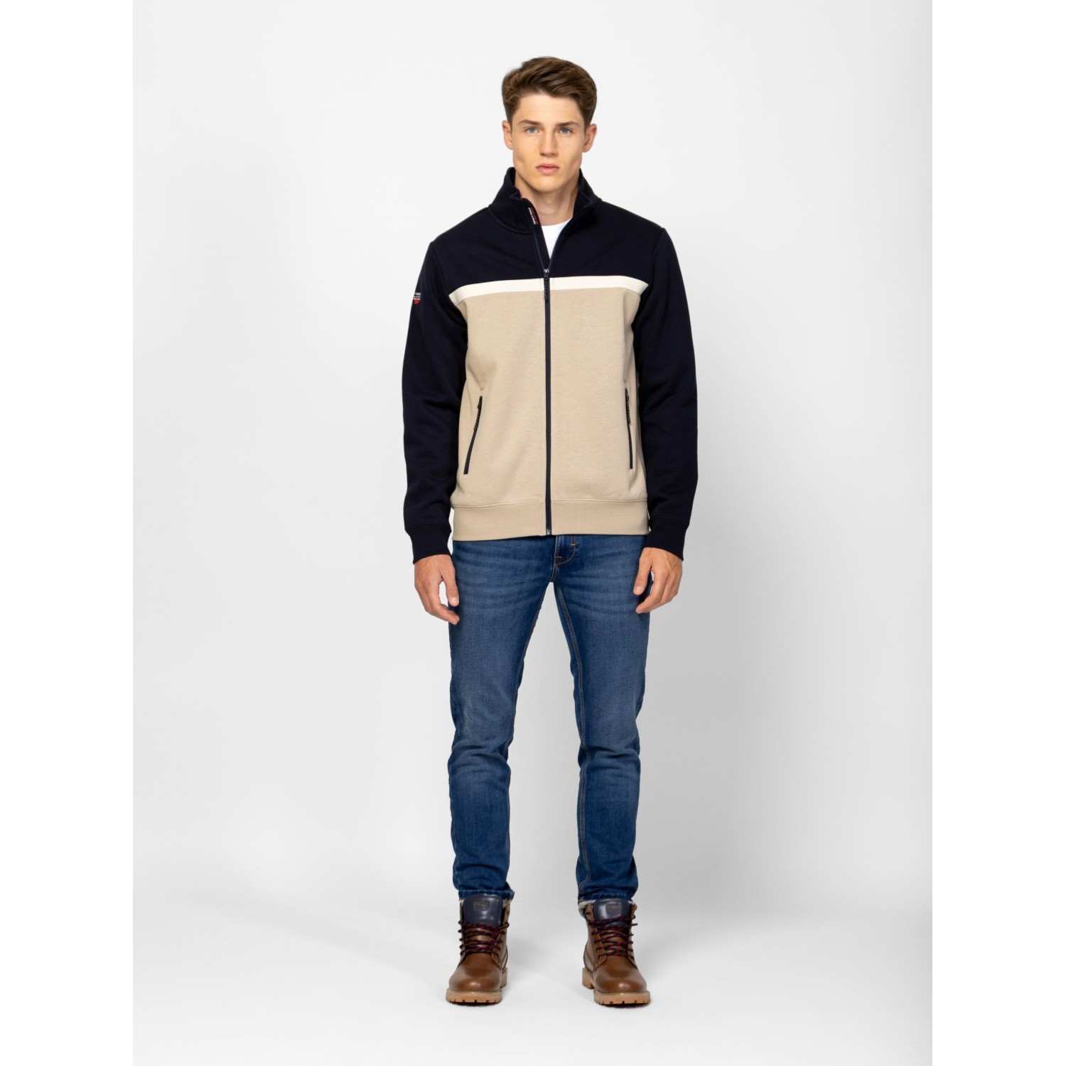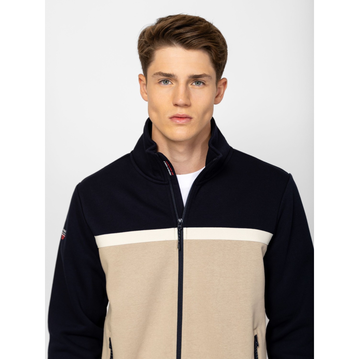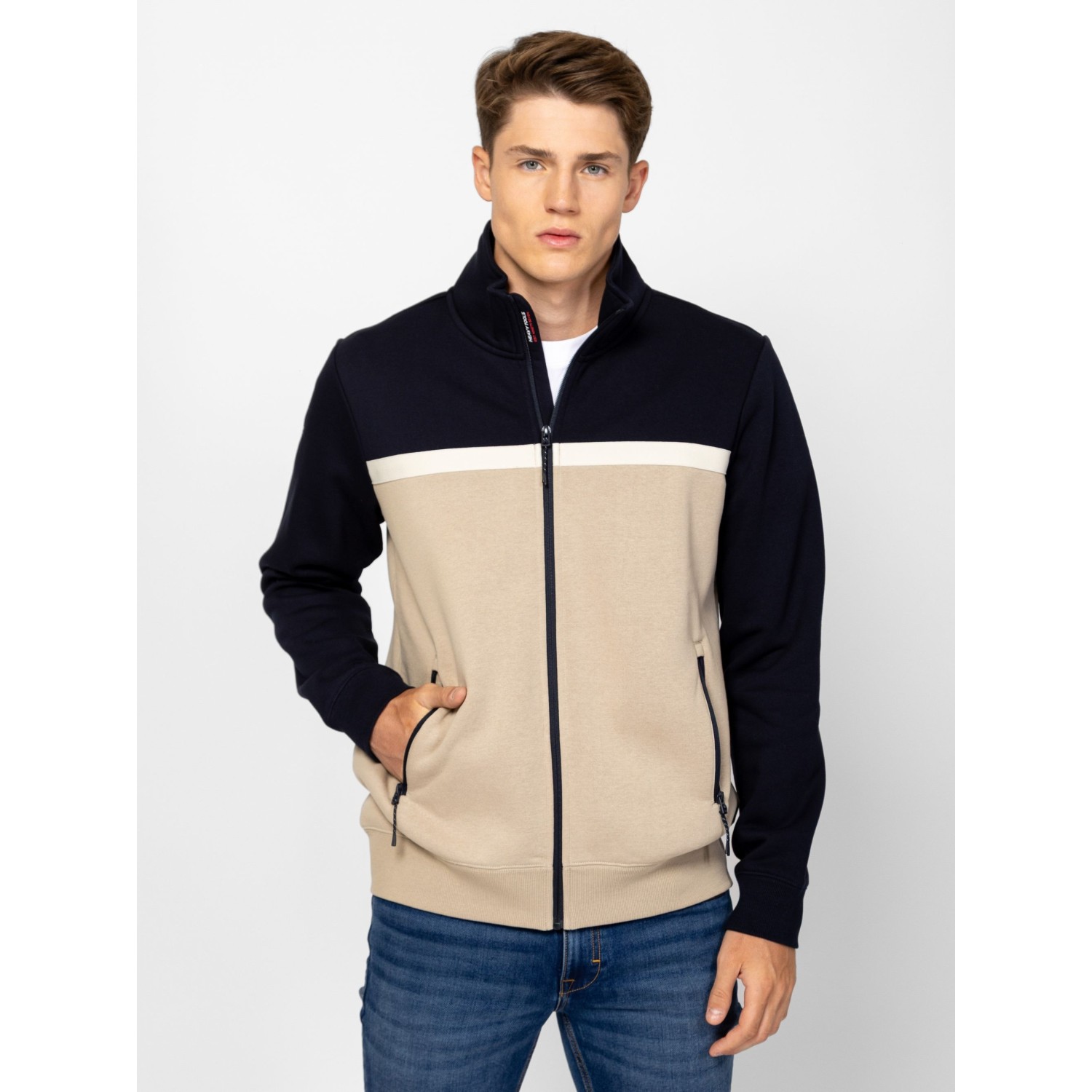 Férfi cipzáros, állógalléros pulóver, sportos szabással, bordás passzés kézelővel és aljjal, cipzáros zsebekkel, kis nyomott márkajelzéssel az elején és a hátán. Anyaga: 80% pamut, 20% poliészter, belül bolyhozott fleece. A modell 188 cm magas és L-es méretet visel.