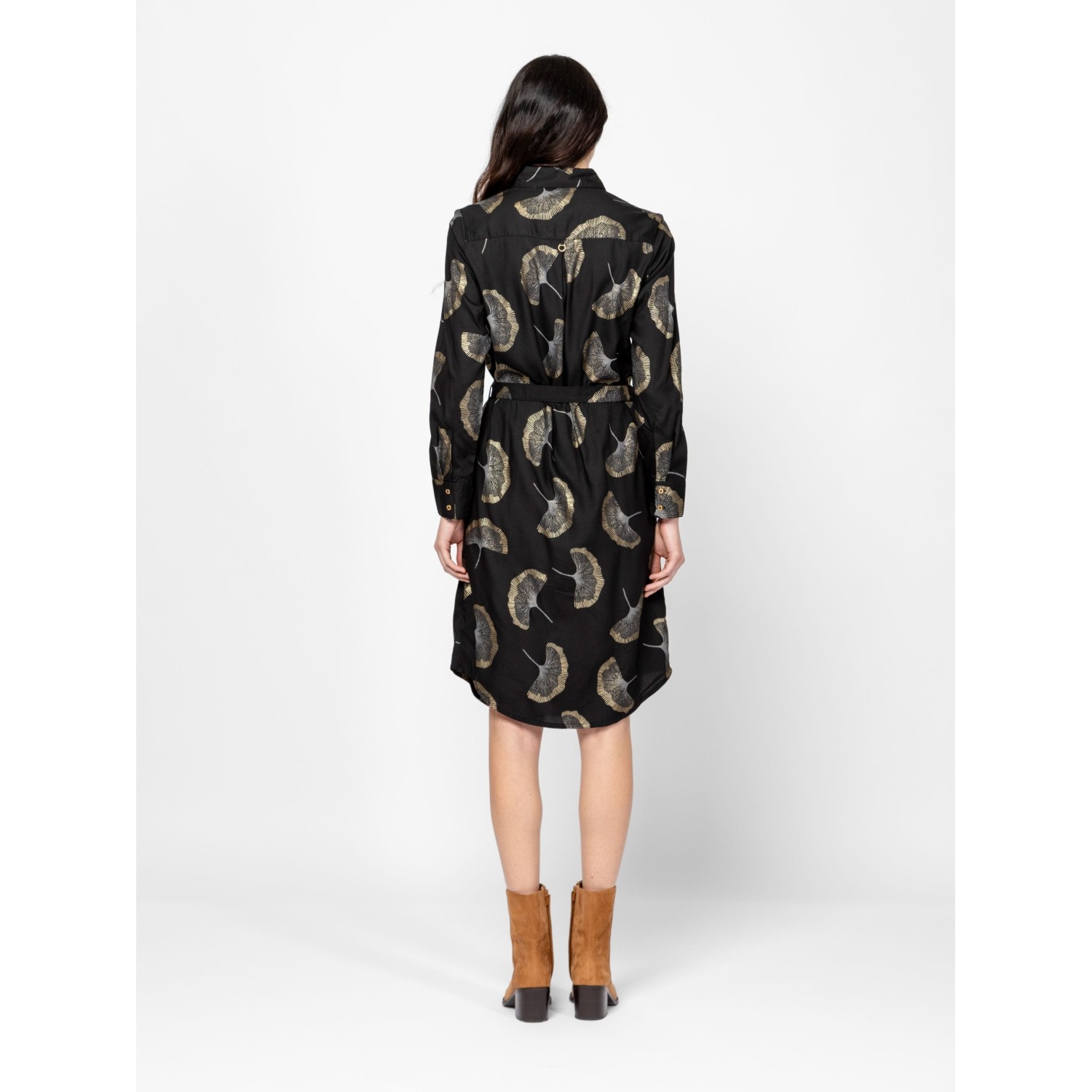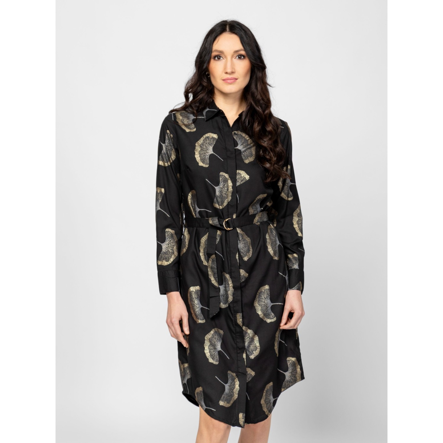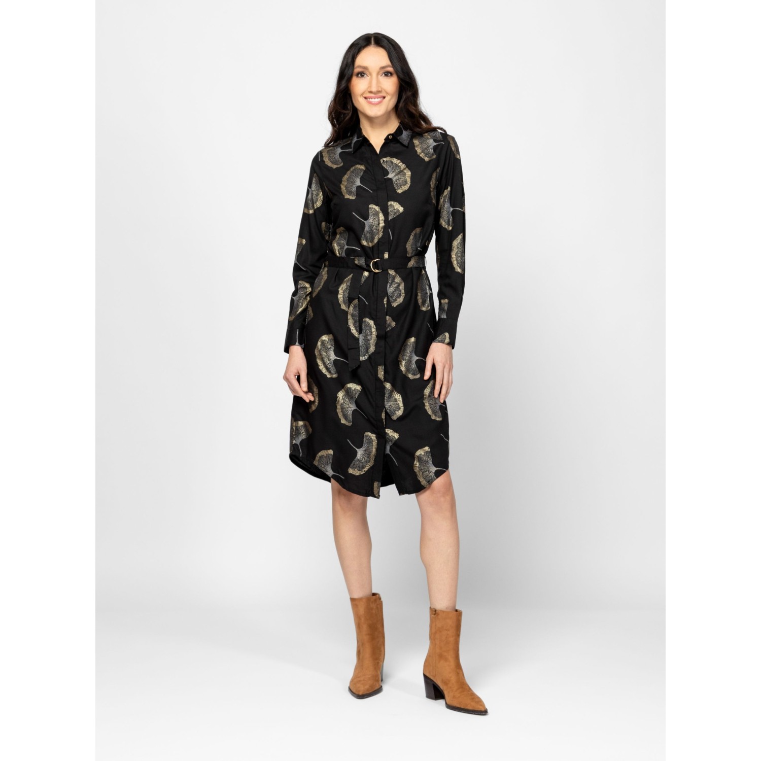 Női ingruha, egyenes szabással, térd alatti hosszal, dekoratív gallér megoldással, rejtett gombolással, övvel állítható derékkal, izgalmas mintákkal, könnyen kezelhető anyagból, kis fém márkajelzéssel a hátán. Anyaga: 100% viszkóz. A modell 175 cm magas és S-es méretet visel.