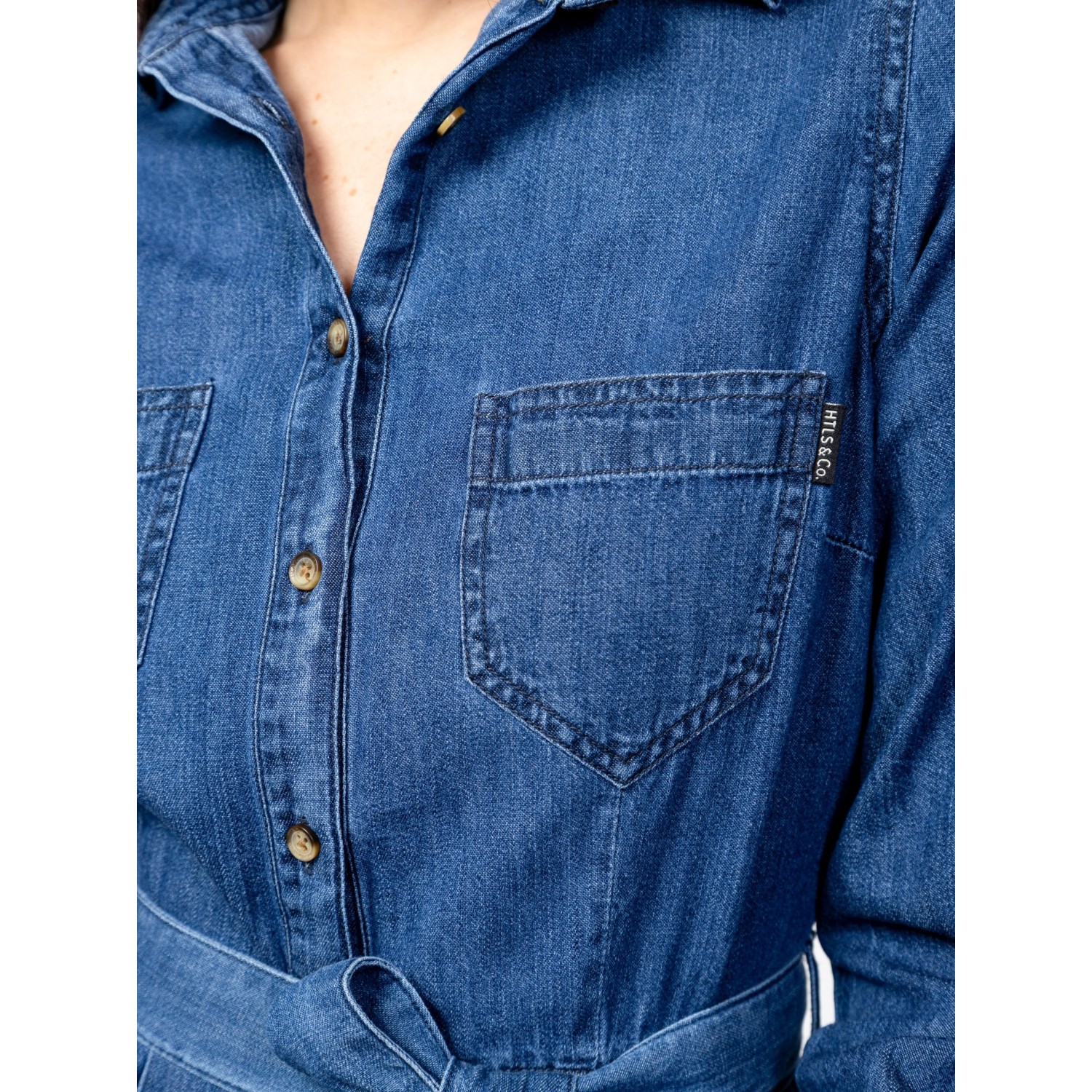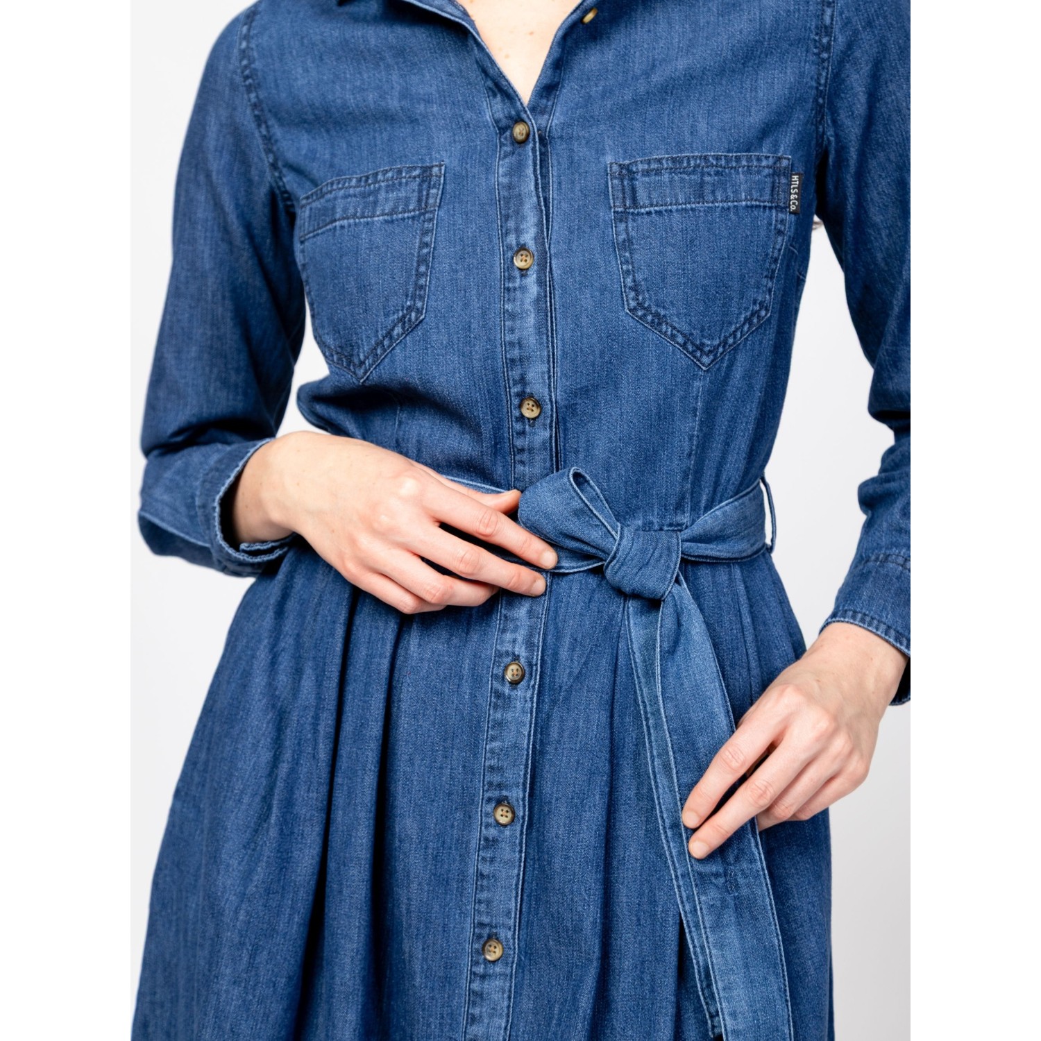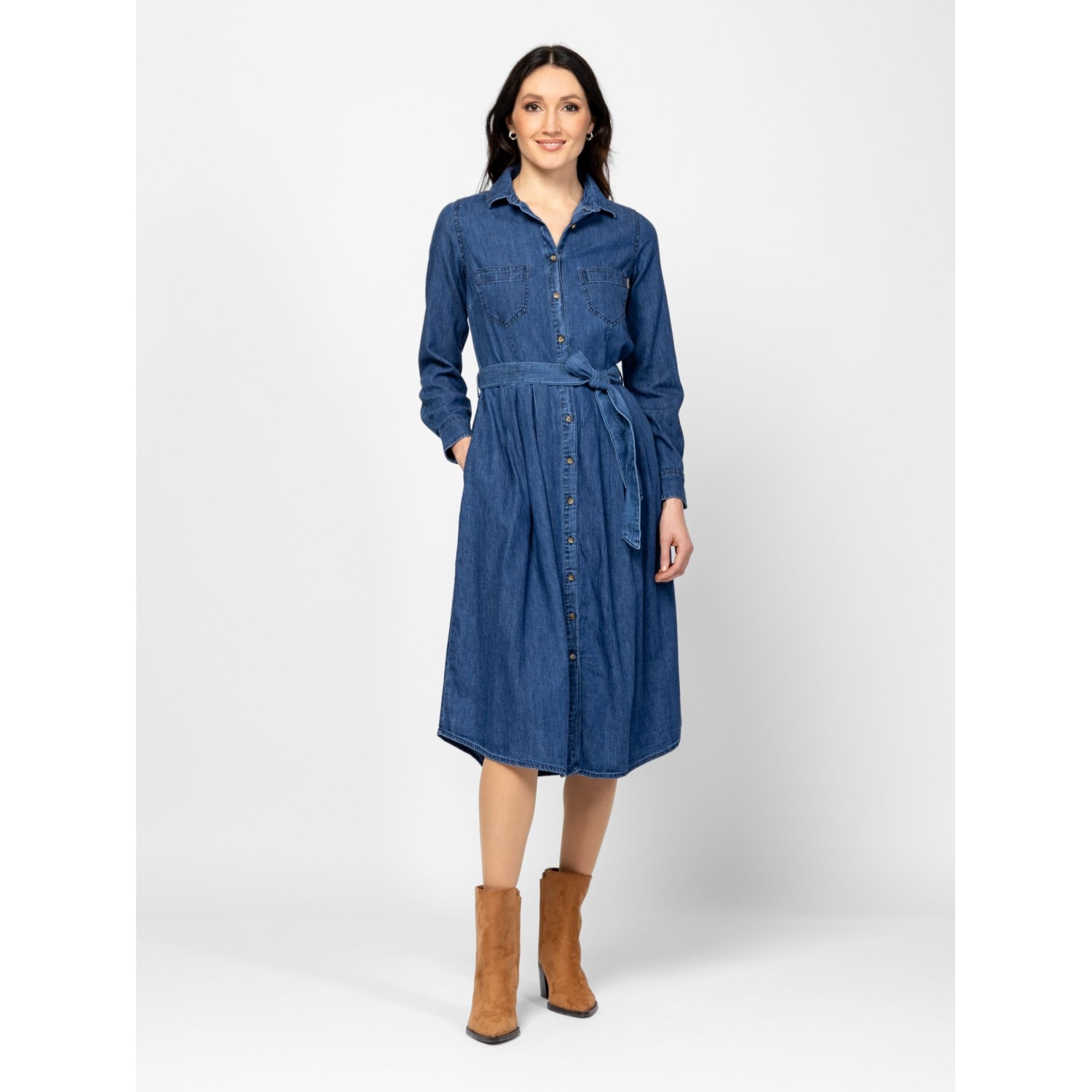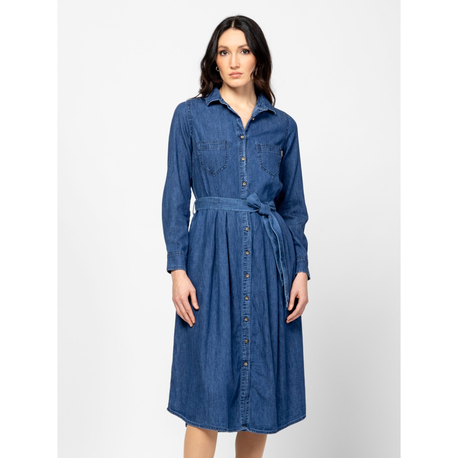 Női farmerruha, klasszikus farmer szabással, térd alatti hosszal, övvel állítható derékkal, elején foltzsebekkel, oldalában zsebbekkel, tiszta pamut anyagból, kis szövott márkajelzéssel a zsebnél. Anyaga: 100% pamut, farmer. A modell 175 cm magas és S-es méretet visel.