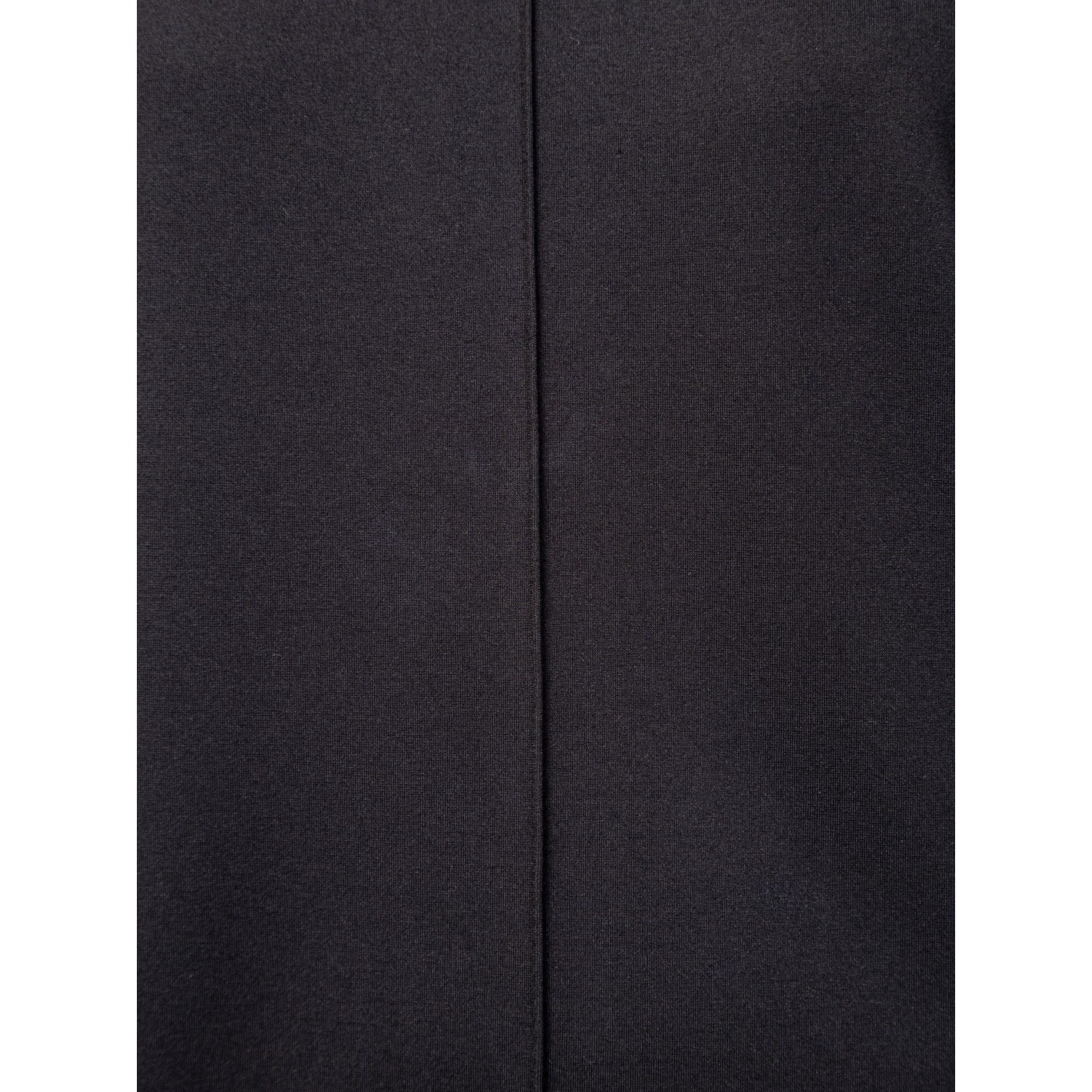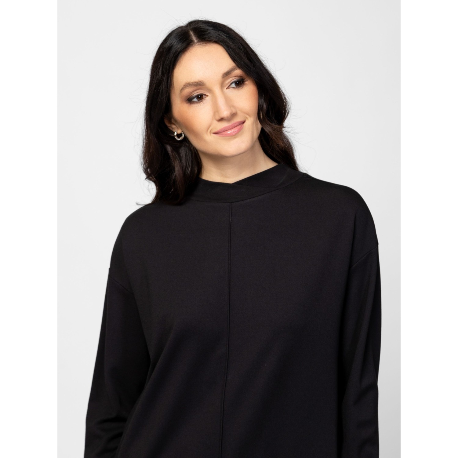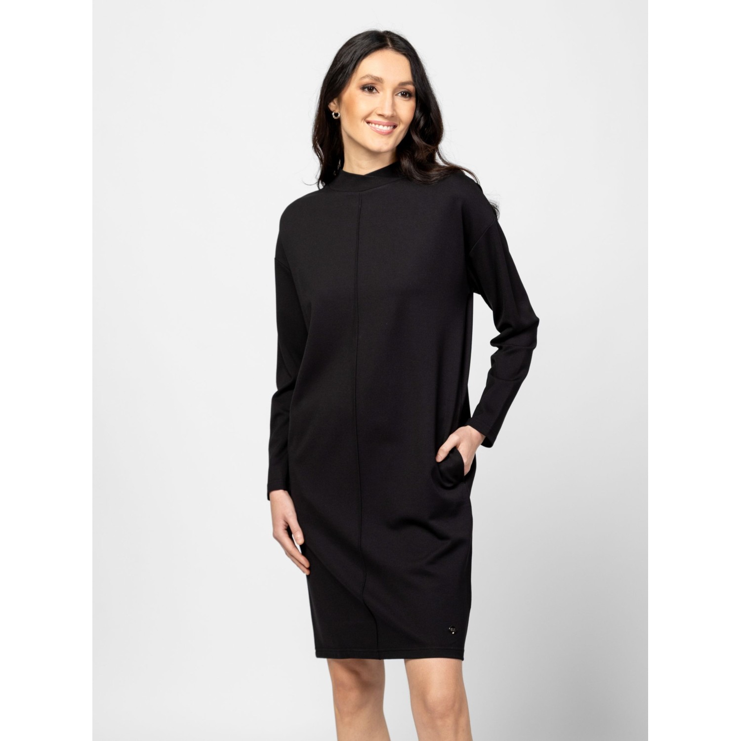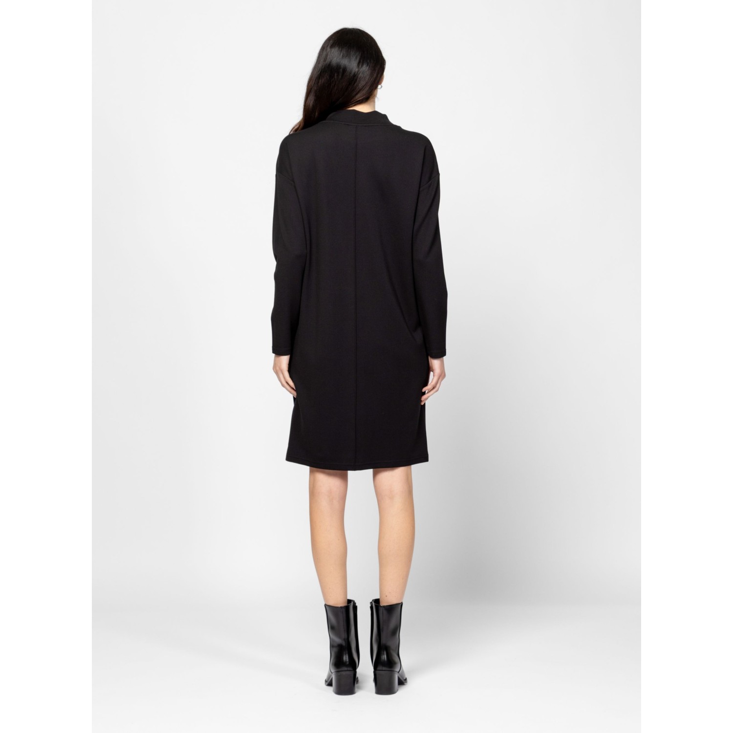 Női ruha, bővebb szabással, térdig érő hosszal, átlapolt álló gallérral, elasztikus anyagból, eleje alján kis fém márkajelzéssel. Anyaga: 63% viszkóz, 32% nylon, 5% elasztán. A modell 175 cm magas és S-es méretet visel.