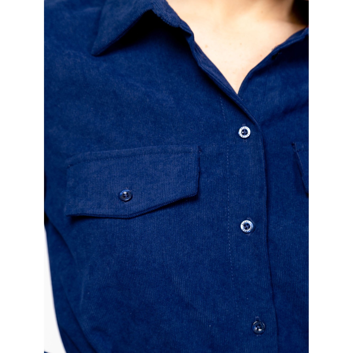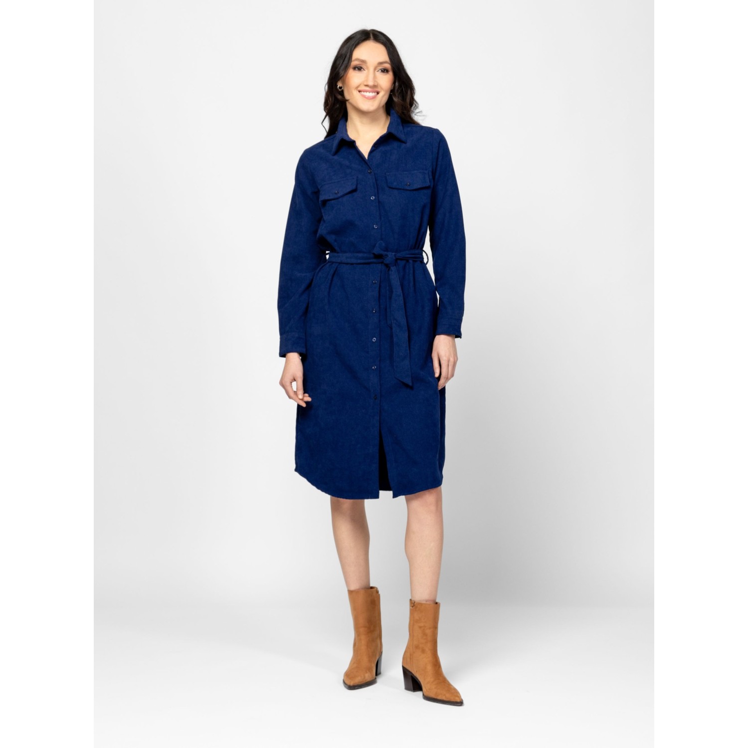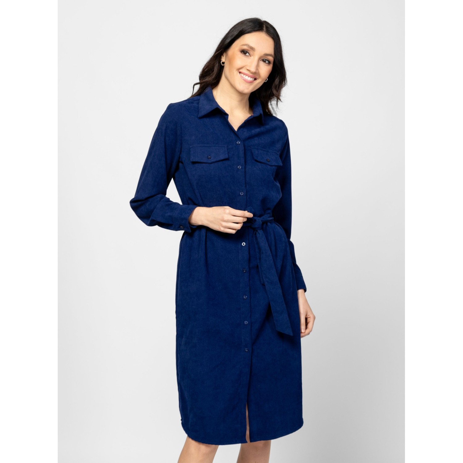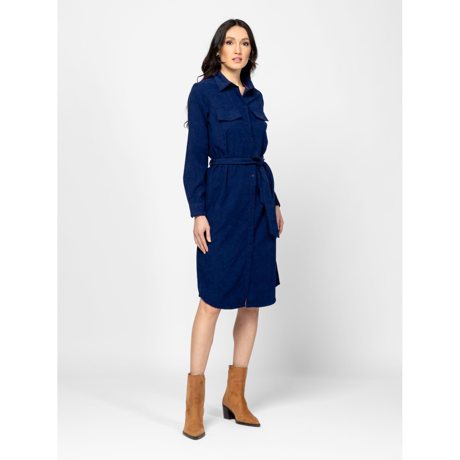 Női kordbársony ruha, klasszikus szabással, térd alatti hosszal, övvel állítható derékkal, eleje mell részen zsebfedővel, kis fém márkajelzéssel a hátán. Anyaga: 98% poliészter, 2% elasztán, microcord. A modell 175 cm magas és S-es méretet visel.