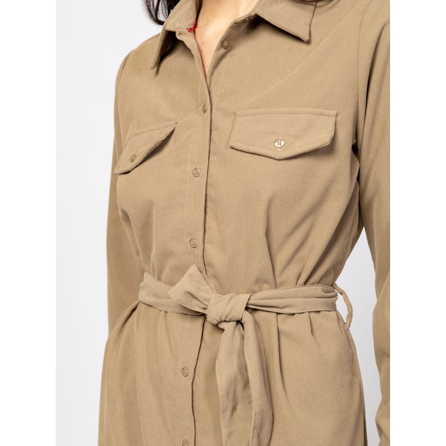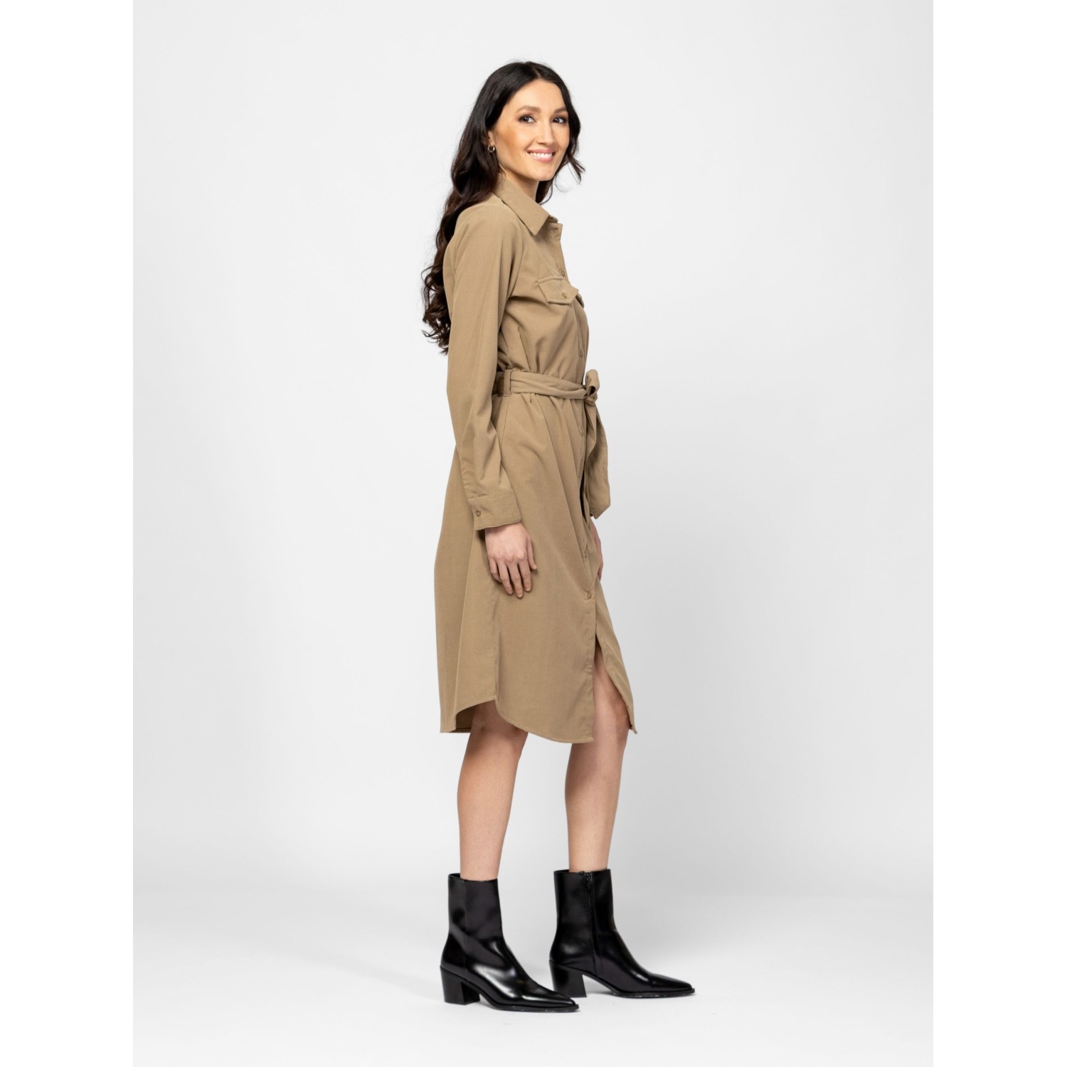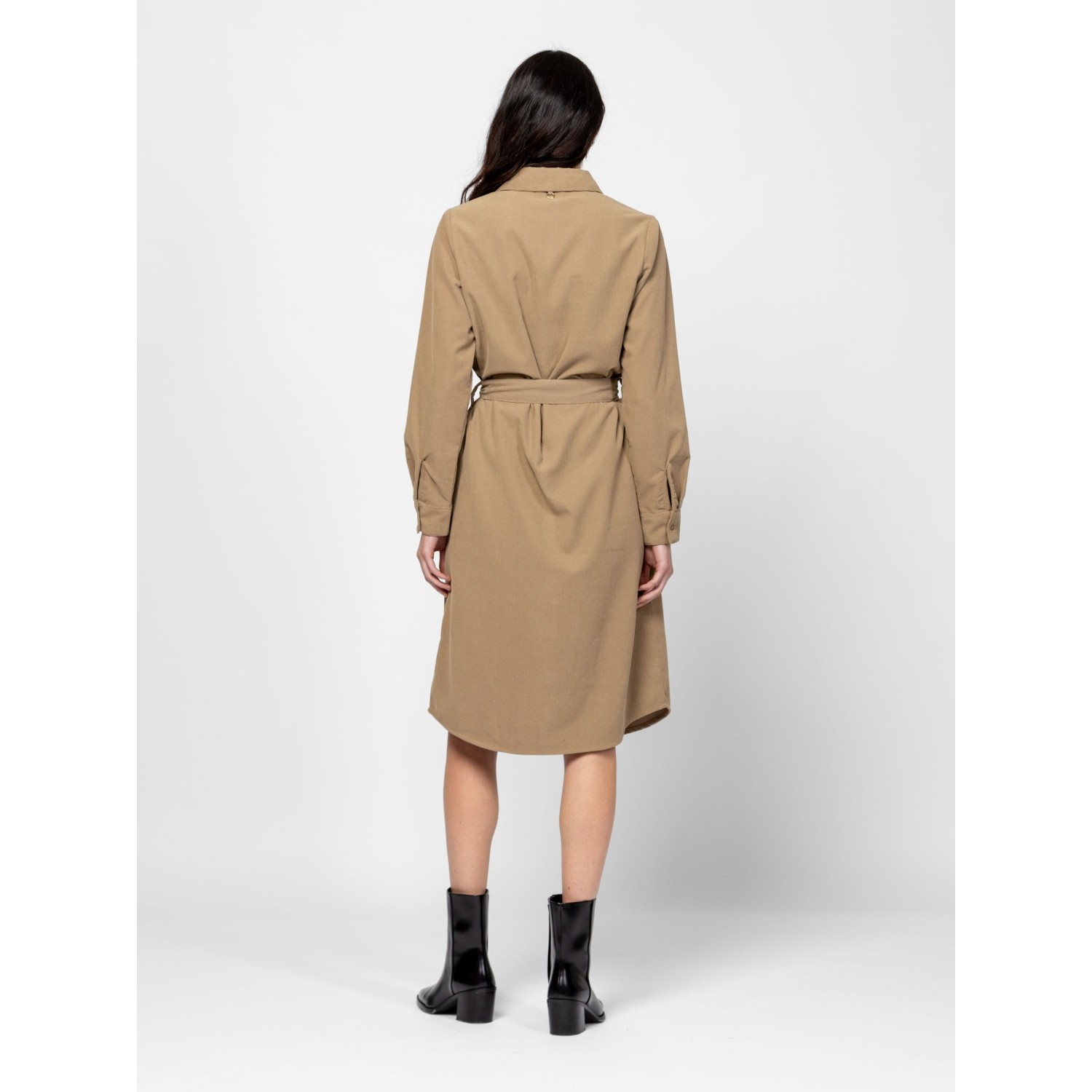 Női kordbársony ruha, klasszikus szabással, térd alatti hosszal, övvel állítható derékkal, eleje mell részen zsebfedővel, kis fém márkajelzéssel a hátán. Anyaga: 98% poliészter, 2% elasztán, microcord. A modell 175 cm magas és S-es méretet visel.