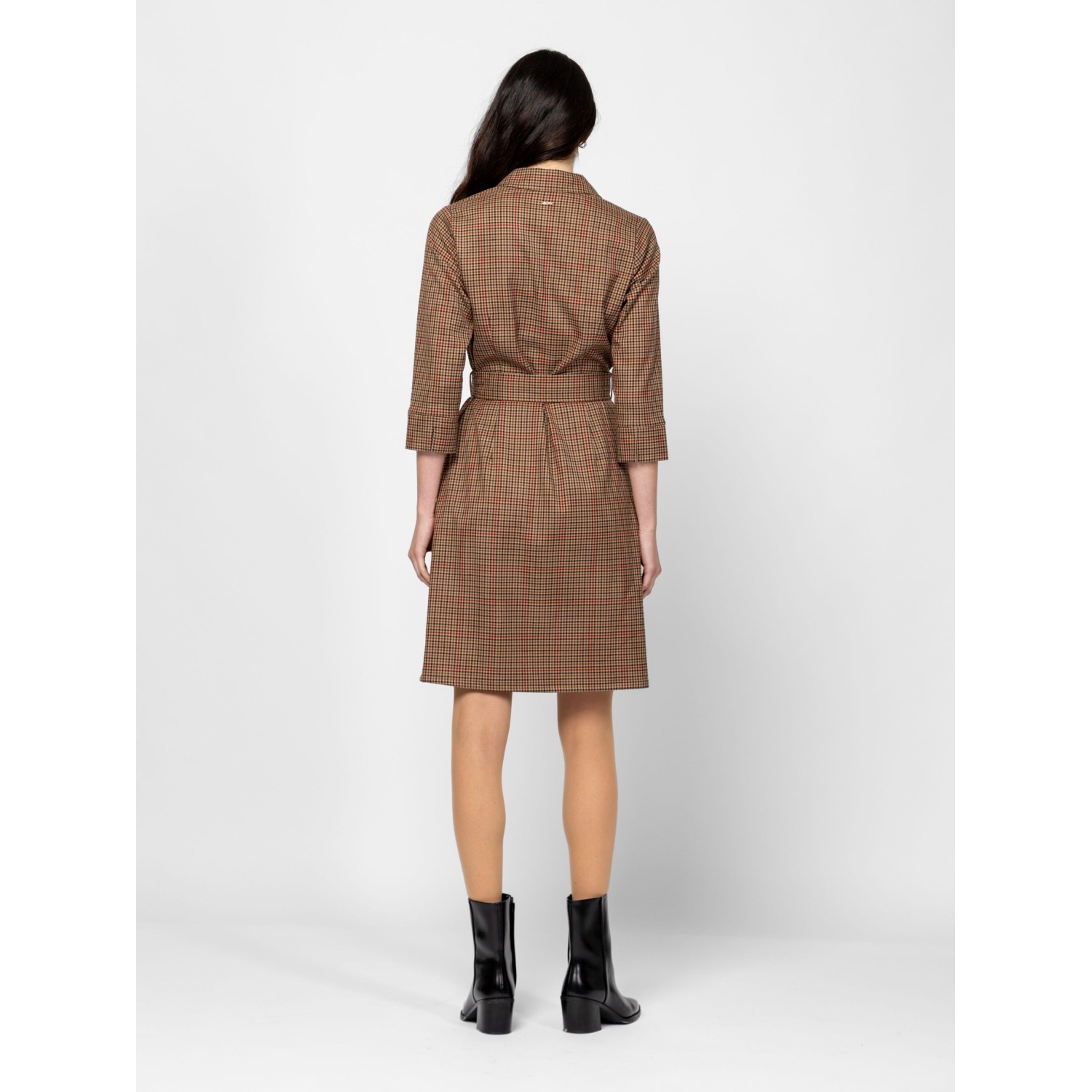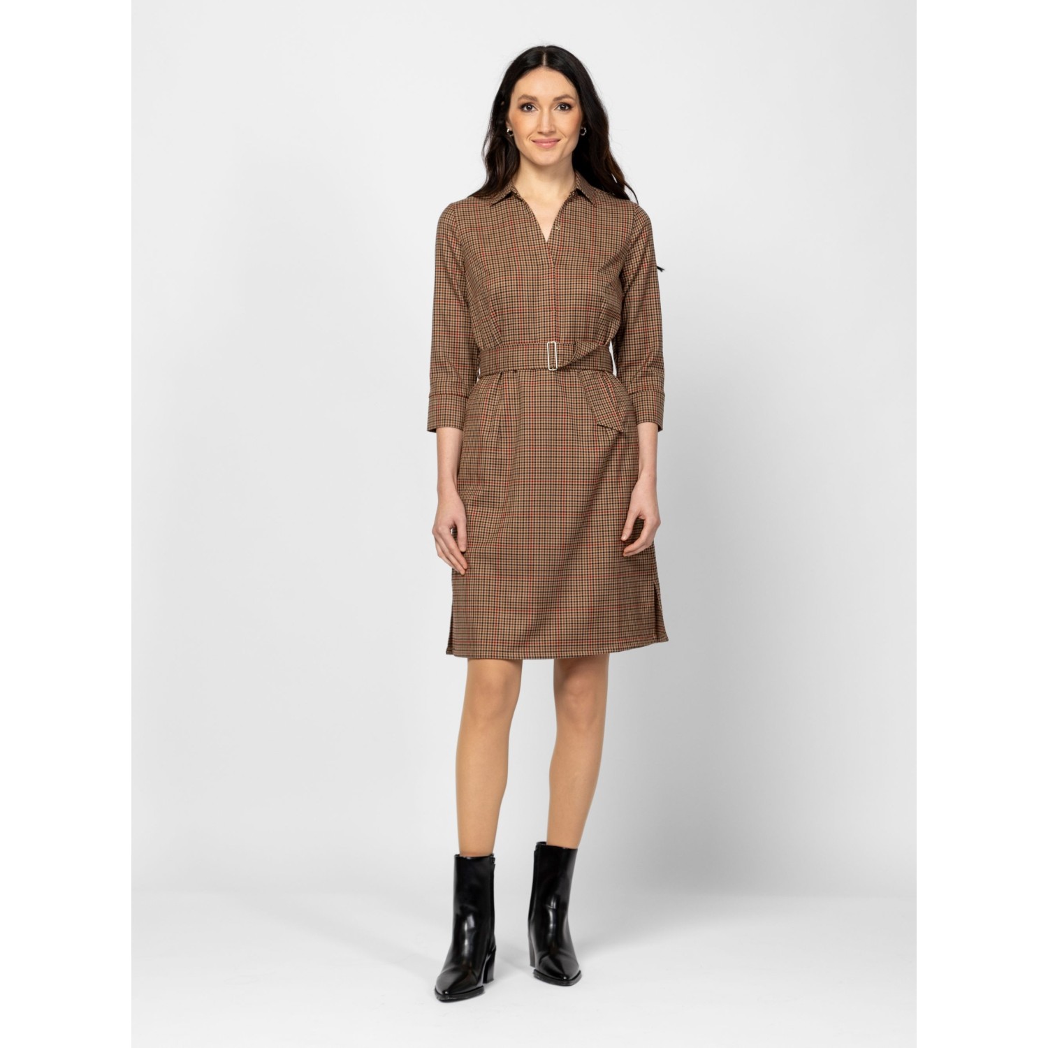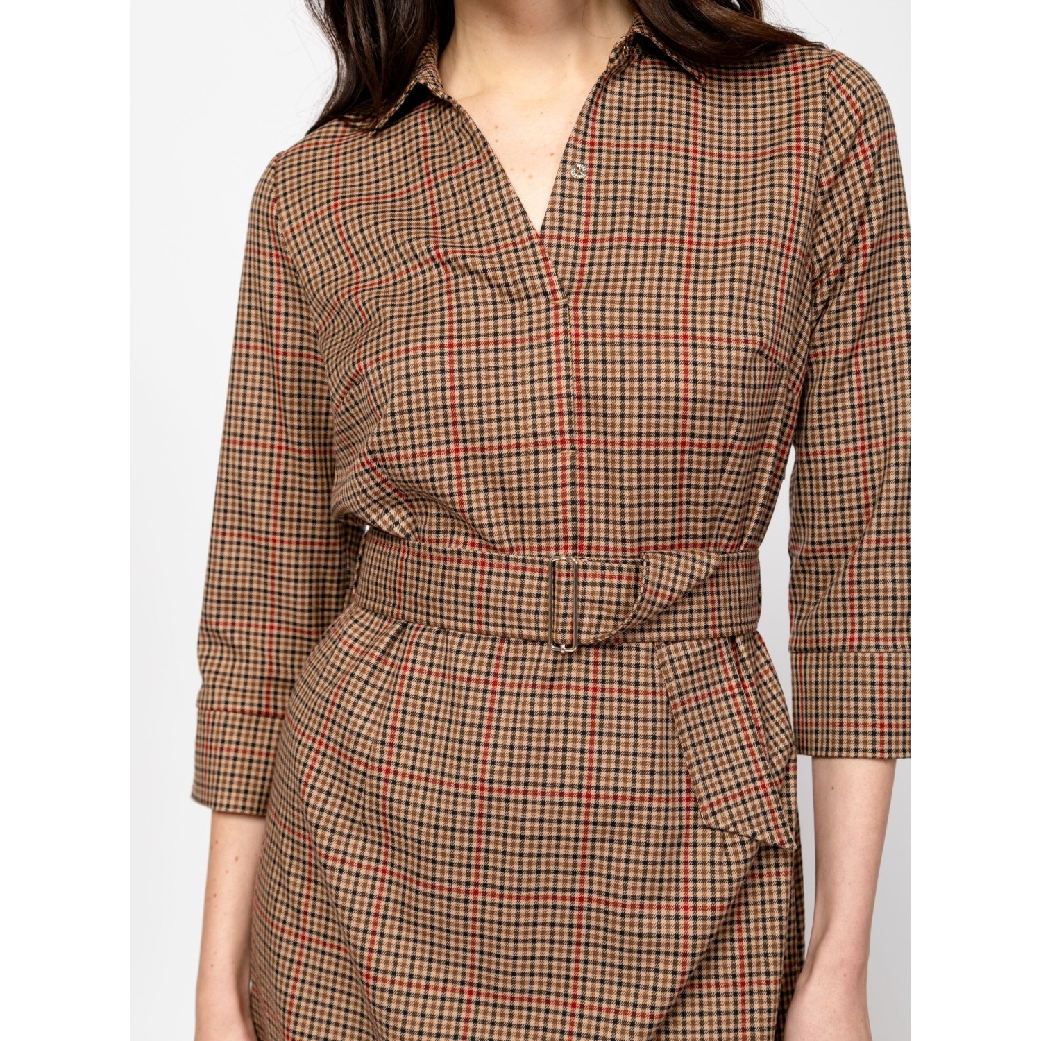 Női 3/4-es ujjú ingruha, karcsúsított szabással, trendi kockás mintával, térdig érő hosszal, alján hasítékkal, galléros, v-nyakkal, övvel, oldalában cipzárral, kis fém márkajelzéssel a hátán. Anyaga: 60% poliészter, 35% viszkóz, 5% elasztán. A modell 175 cm magas és S-es méretet visel.