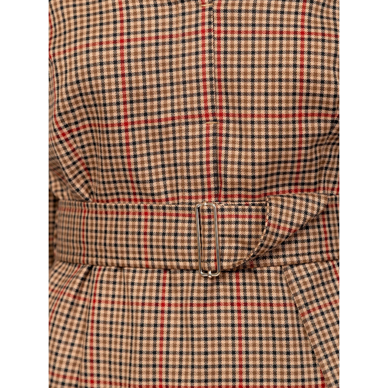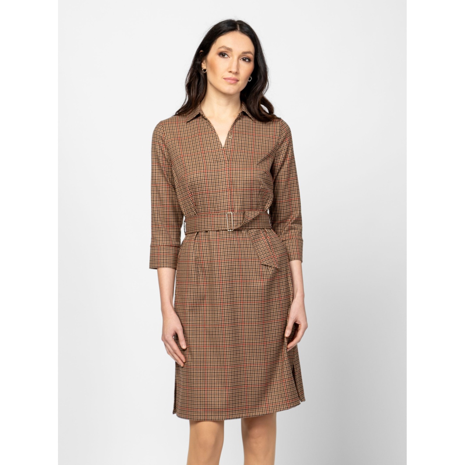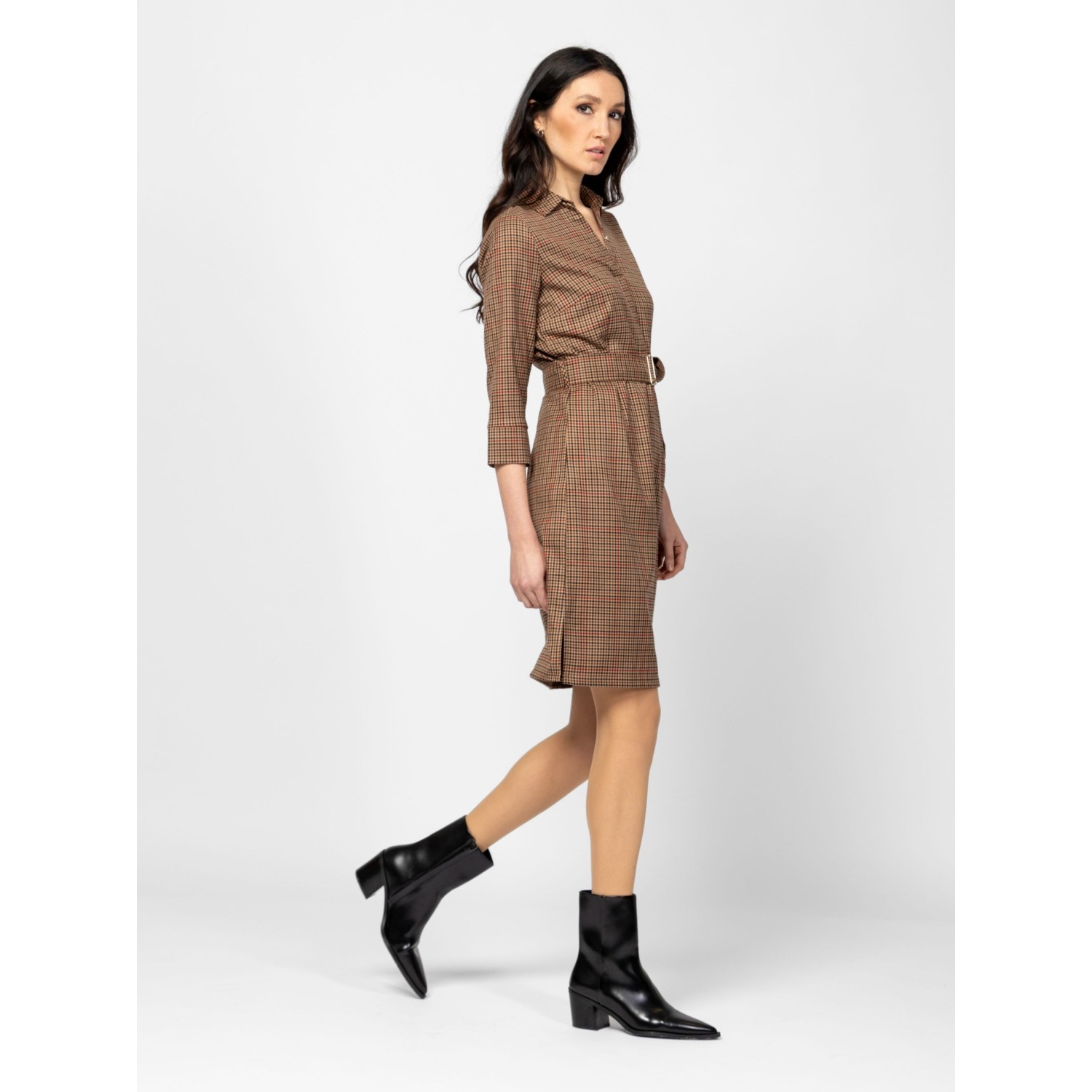 Női 3/4-es ujjú ingruha, karcsúsított szabással, trendi kockás mintával, térdig érő hosszal, alján hasítékkal, galléros, v-nyakkal, övvel, oldalában cipzárral, kis fém márkajelzéssel a hátán. Anyaga: 60% poliészter, 35% viszkóz, 5% elasztán. A modell 175 cm magas és S-es méretet visel.