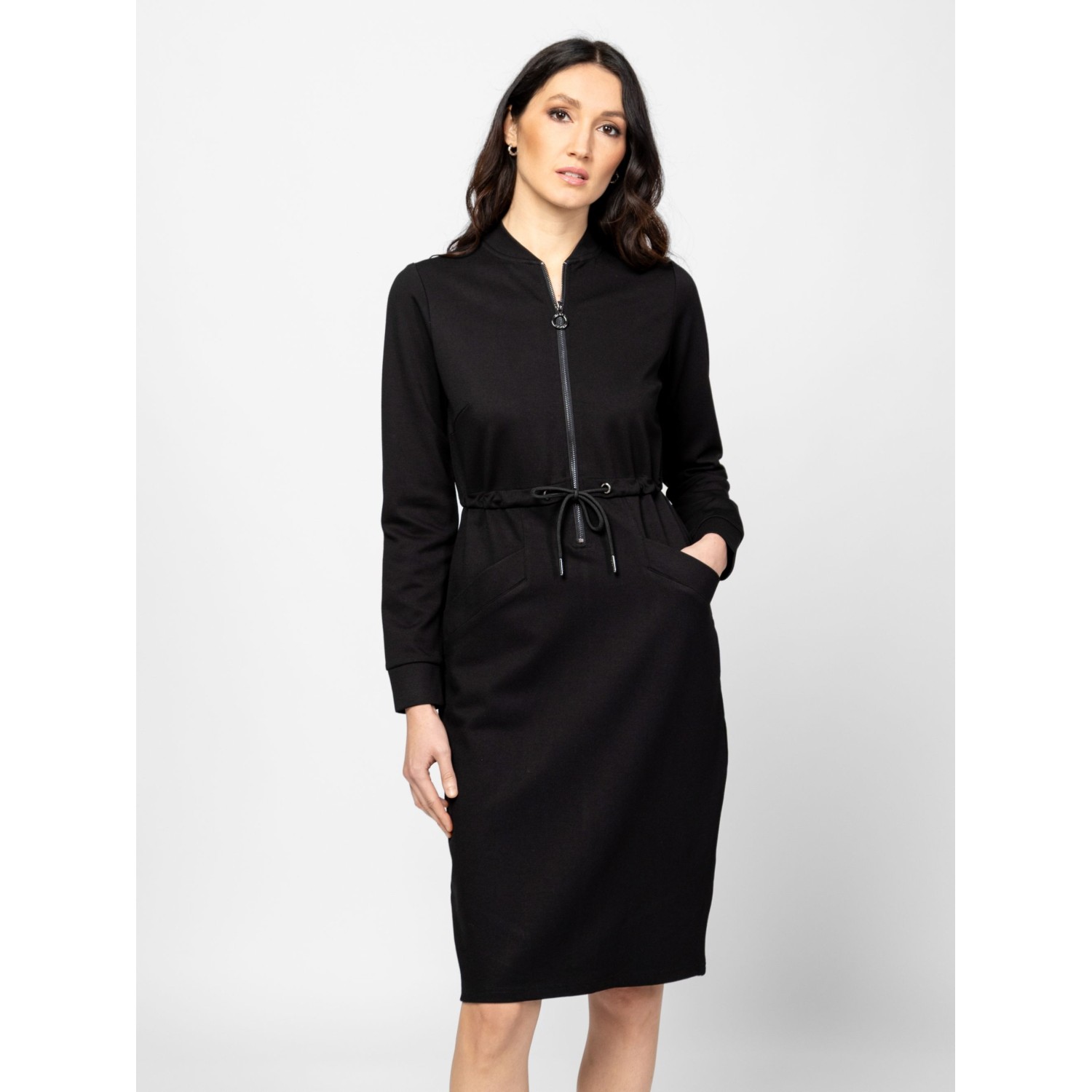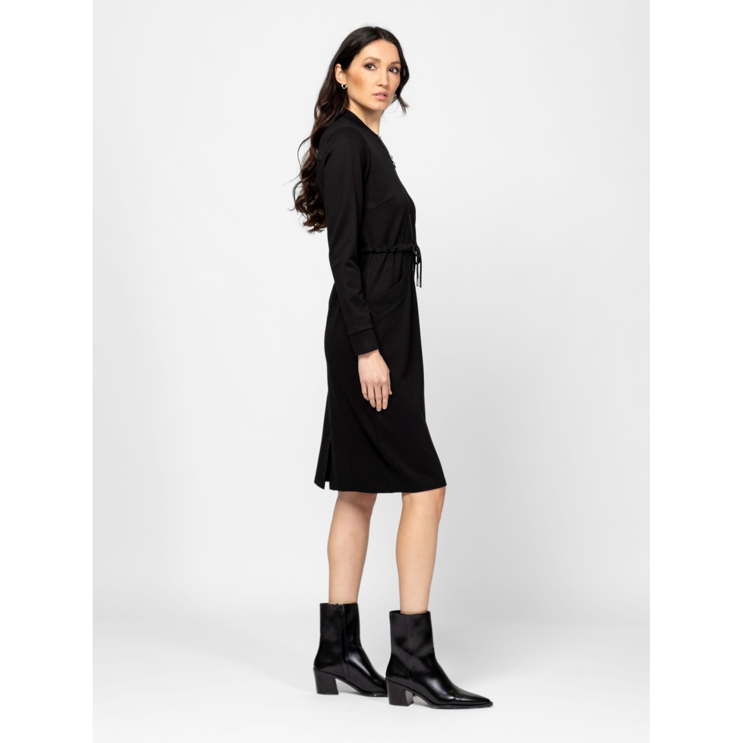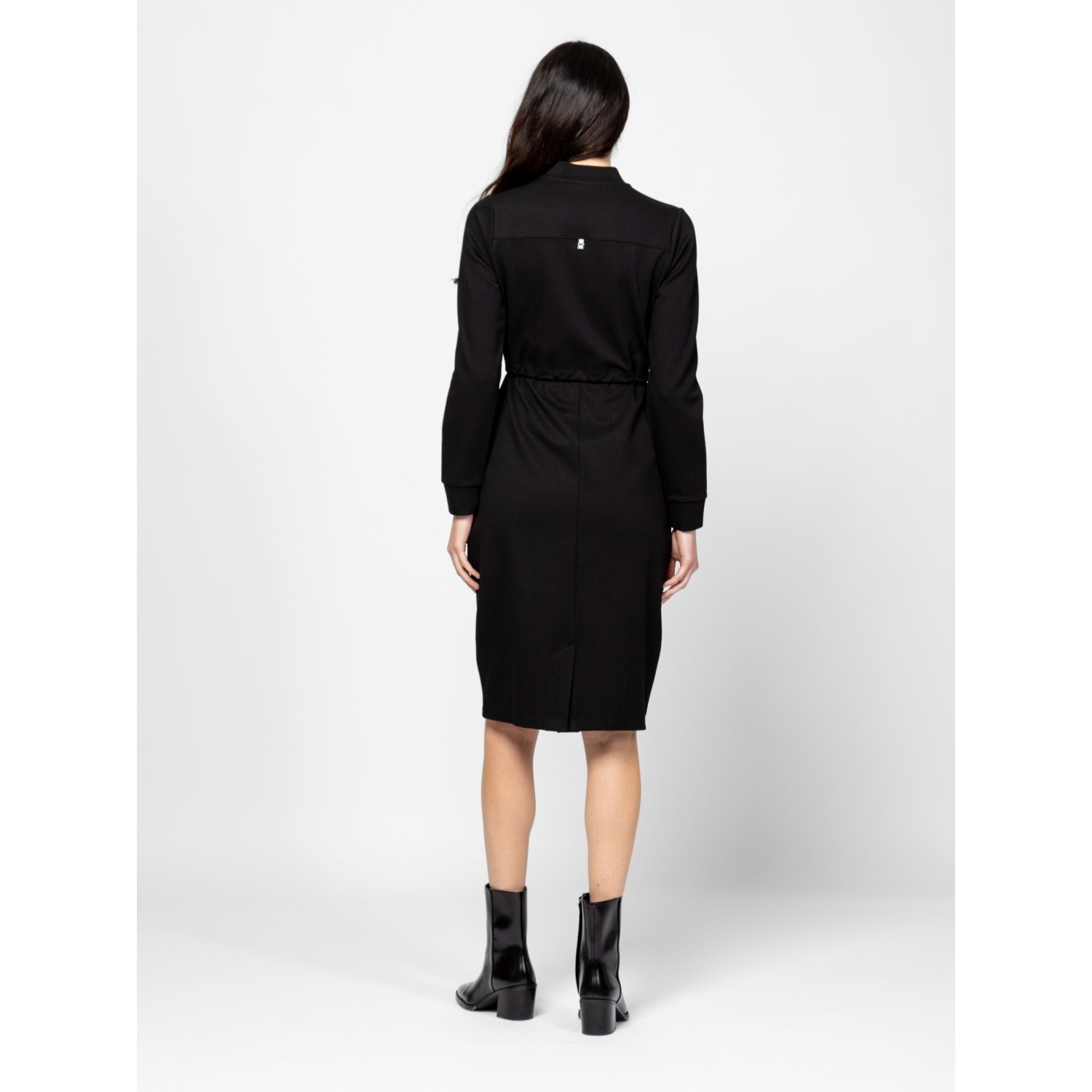 Női ruha, kényelmes, enyhén karcsúsított szabással, elején cipzárral, álló gallérral, húzózsinorral állítható derékkal, szabásvonalba helyezett zsebekkel, elasztikus anyagból, kis fém márkajelzéssel a hátán. Anyaga: 67% viszkóz, 28% nylon, 5% elasztán, twill. A modell 175 cm magas és S-es méretet visel.