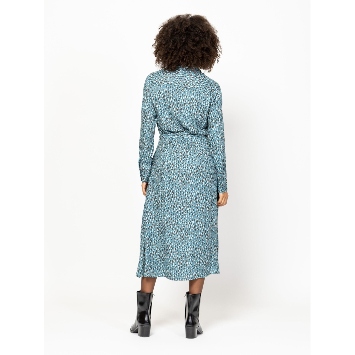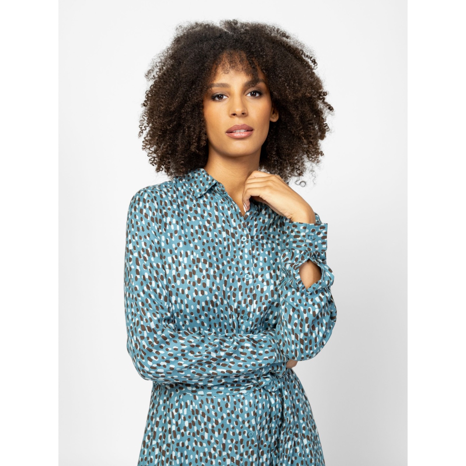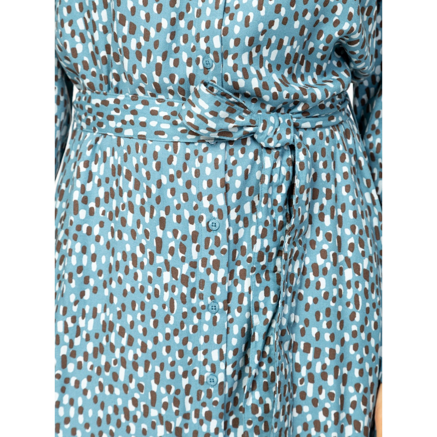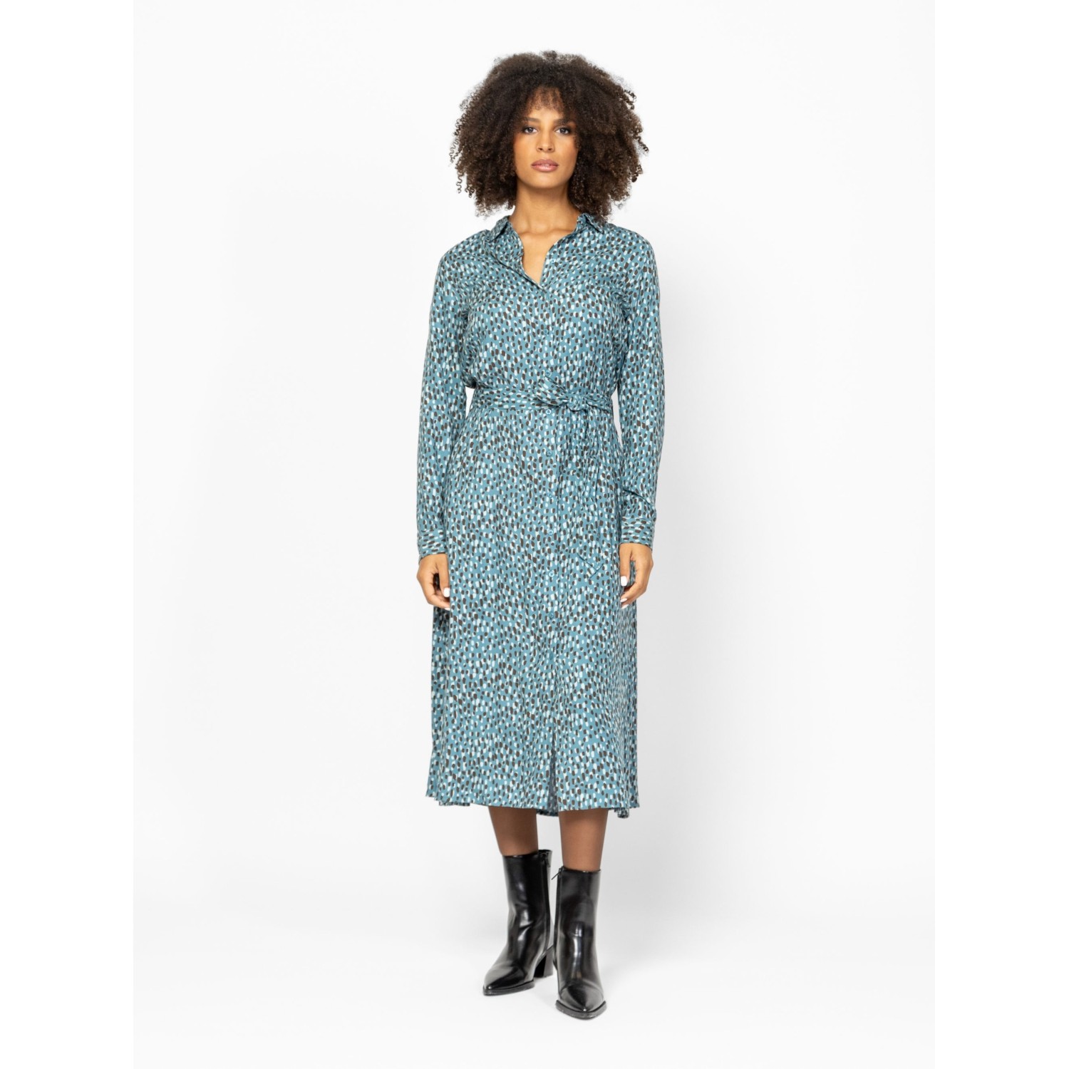 Női ingruha, nőies szabással, midi hosszal, gombos-galléros megoldással, övvel állítható derékkal, izgalmas mintákkal, könnyen kezelhető anyagból, kis fém márkajelzéssel a hátán. Anyaga: 100% viszkóz, twill. A modell 175 cm magas és S-es méretet visel.