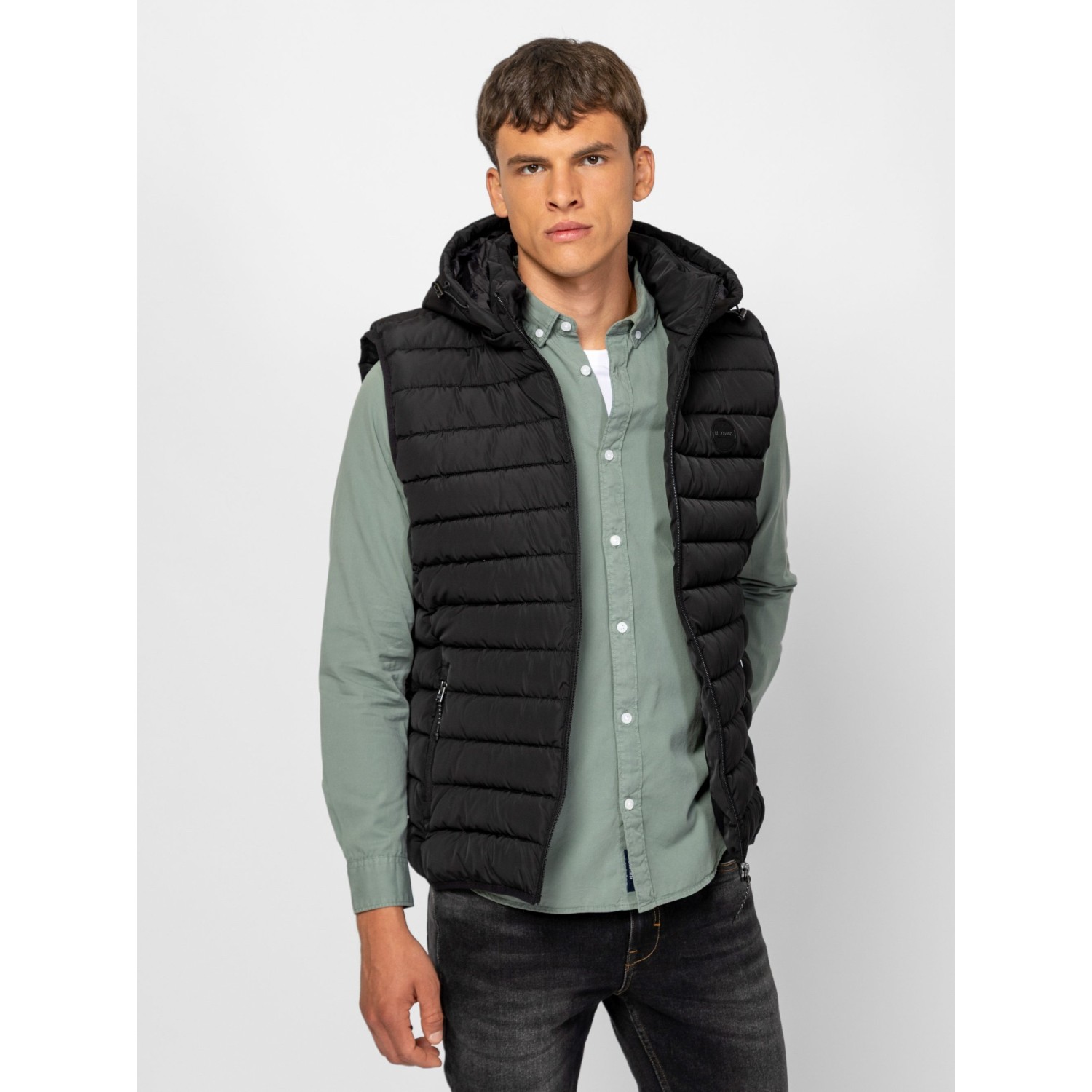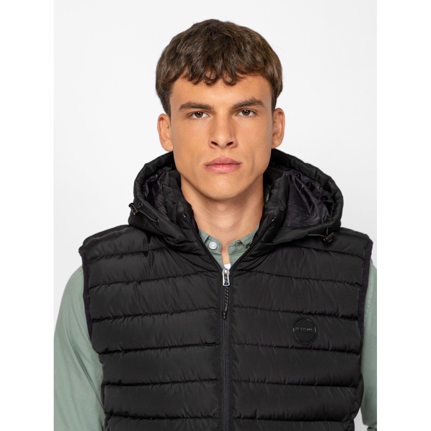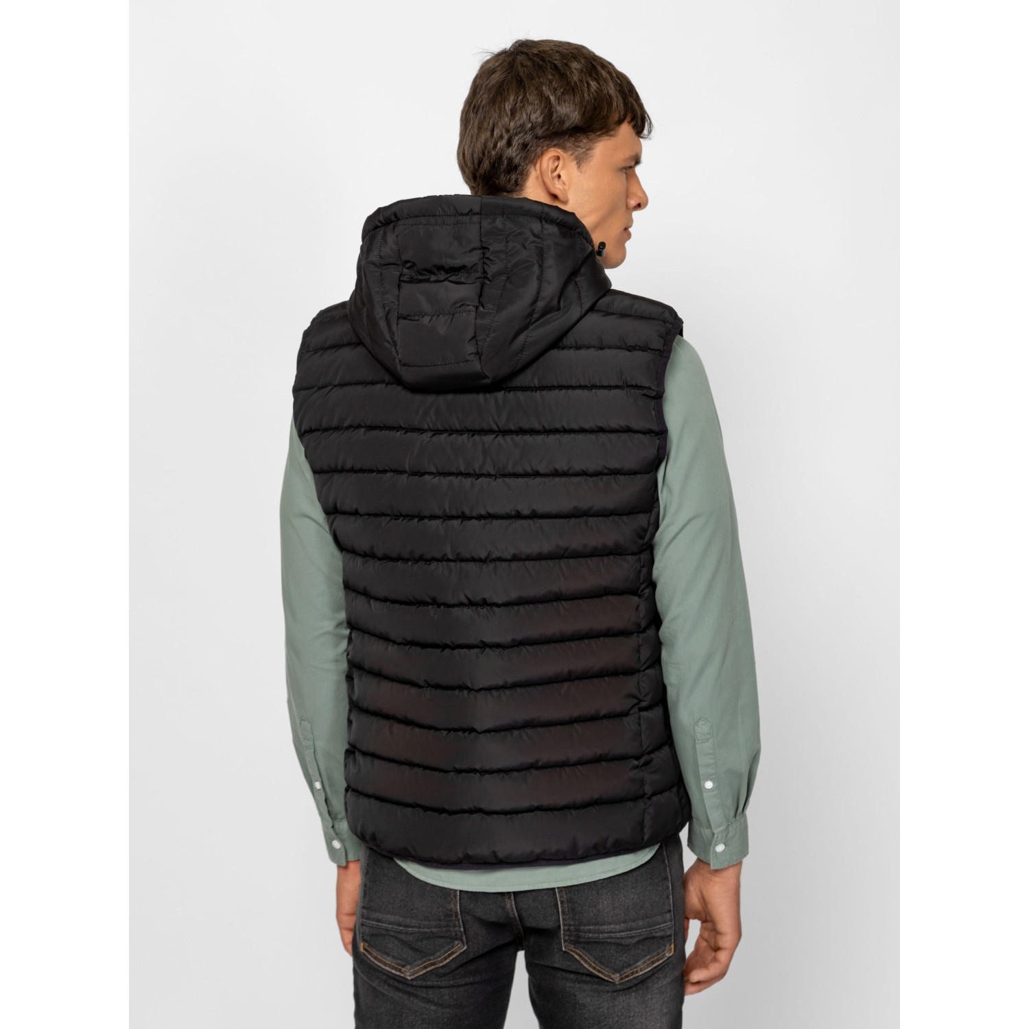Férfi steppelt, kapucnis mellény, kényelmes szabással, állítható és levehető kapucnival, szabásvonalba helyezett, cipzáros zsebekkel, belső zsebbel és kis márkajelzéssel az elején. Anyaga: külső: 100% poliészter, bélés: 100% nylon, tömés: 100% poliészter. A modell 188 cm magas és L-es méretet visel.