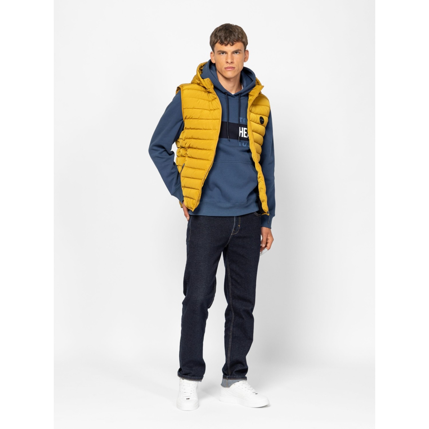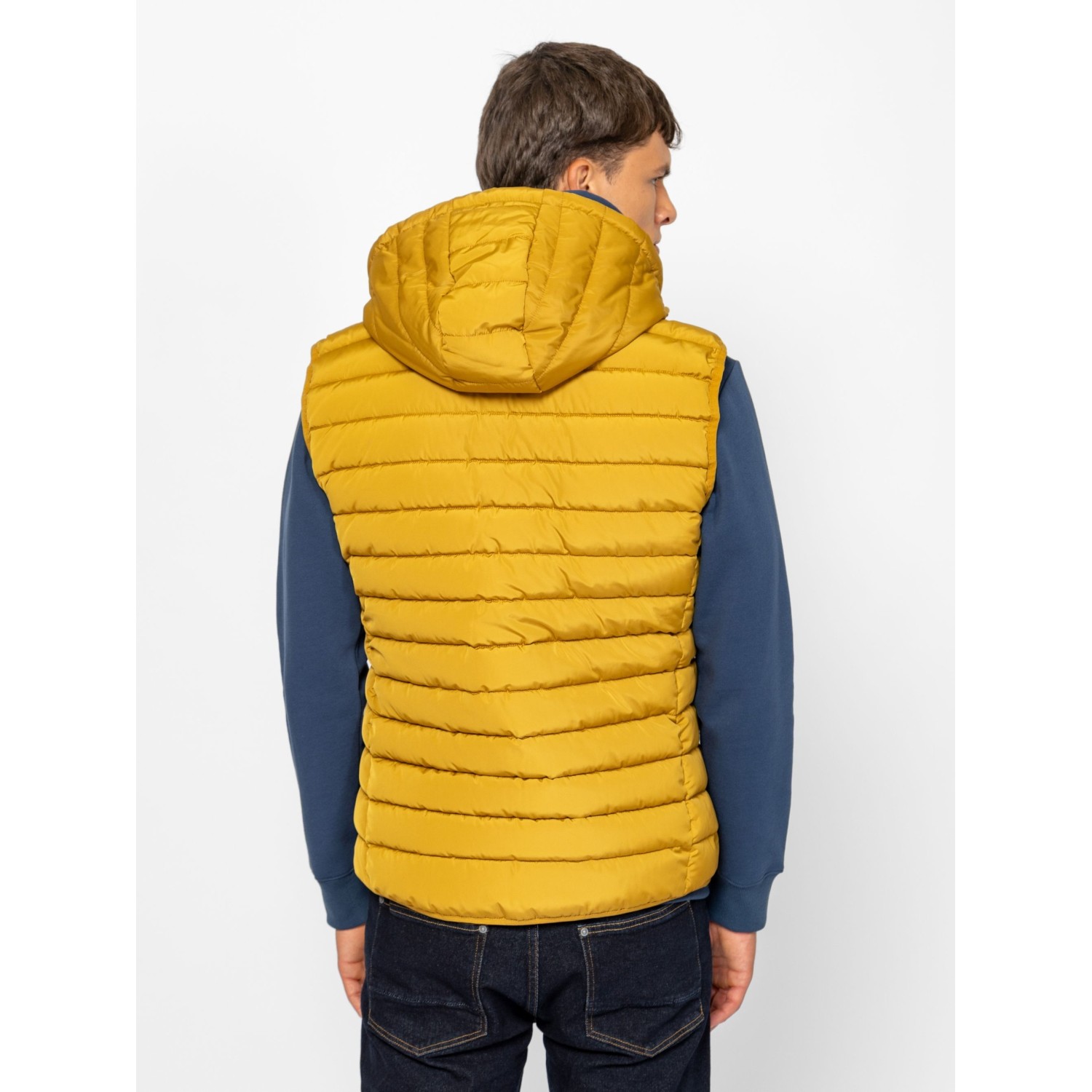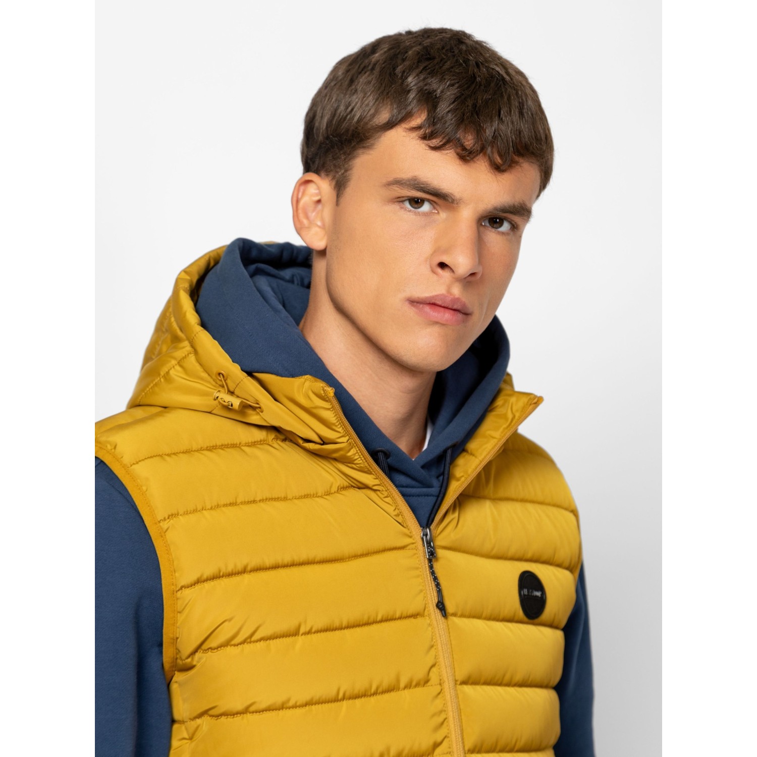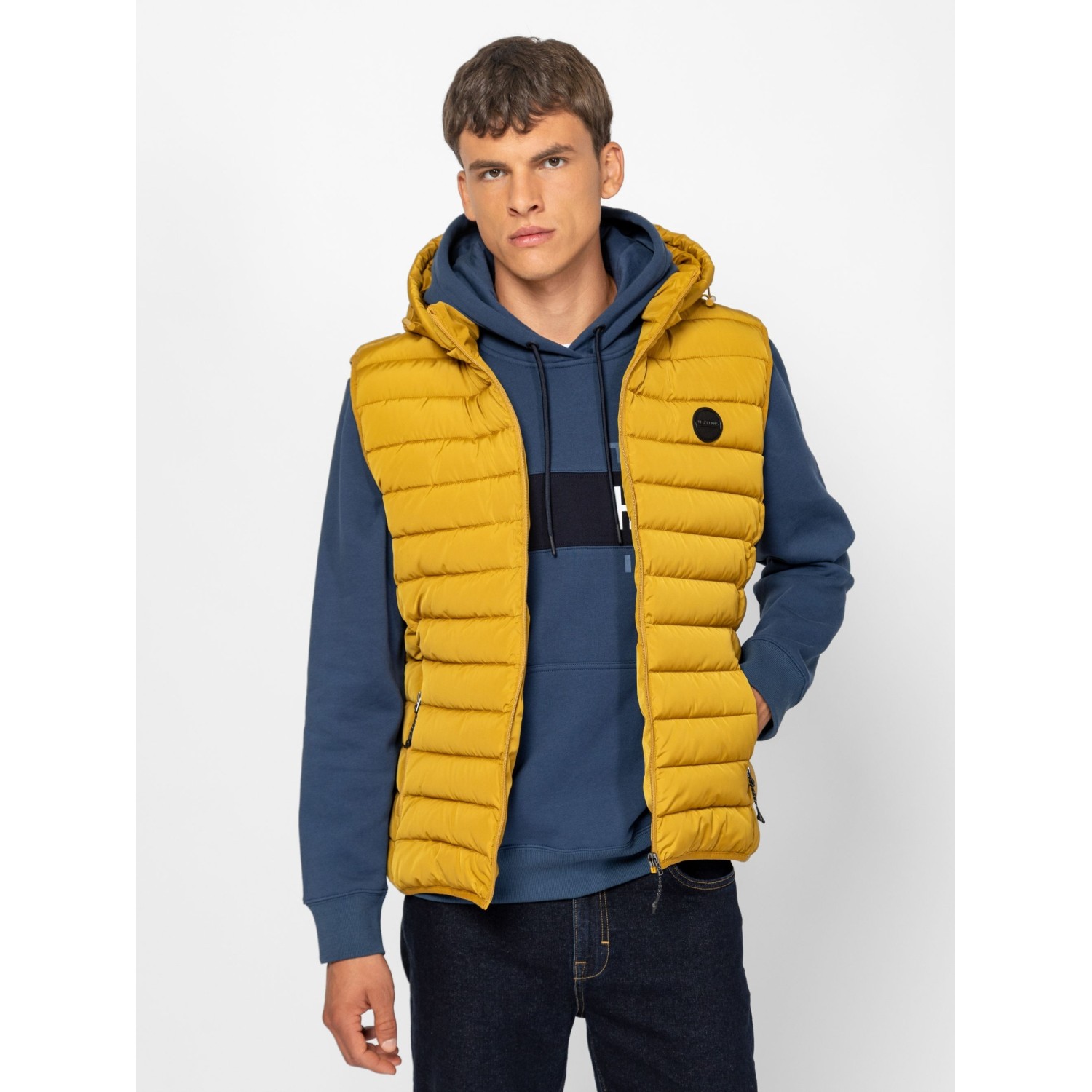Férfi steppelt, kapucnis mellény, kényelmes szabással, állítható és levehető kapucnival, szabásvonalba helyezett, cipzáros zsebekkel, belső zsebbel és kis márkajelzéssel az elején. Anyaga: külső: 100% poliészter, bélés: 100% nylon, tömés: 100% poliészter. A modell 188 cm magas és L-es méretet visel.
