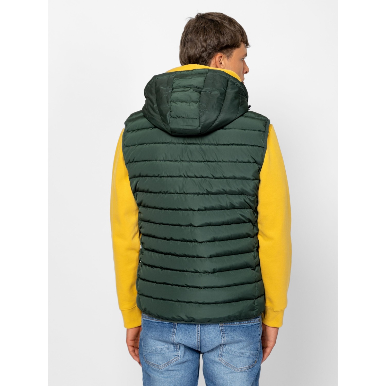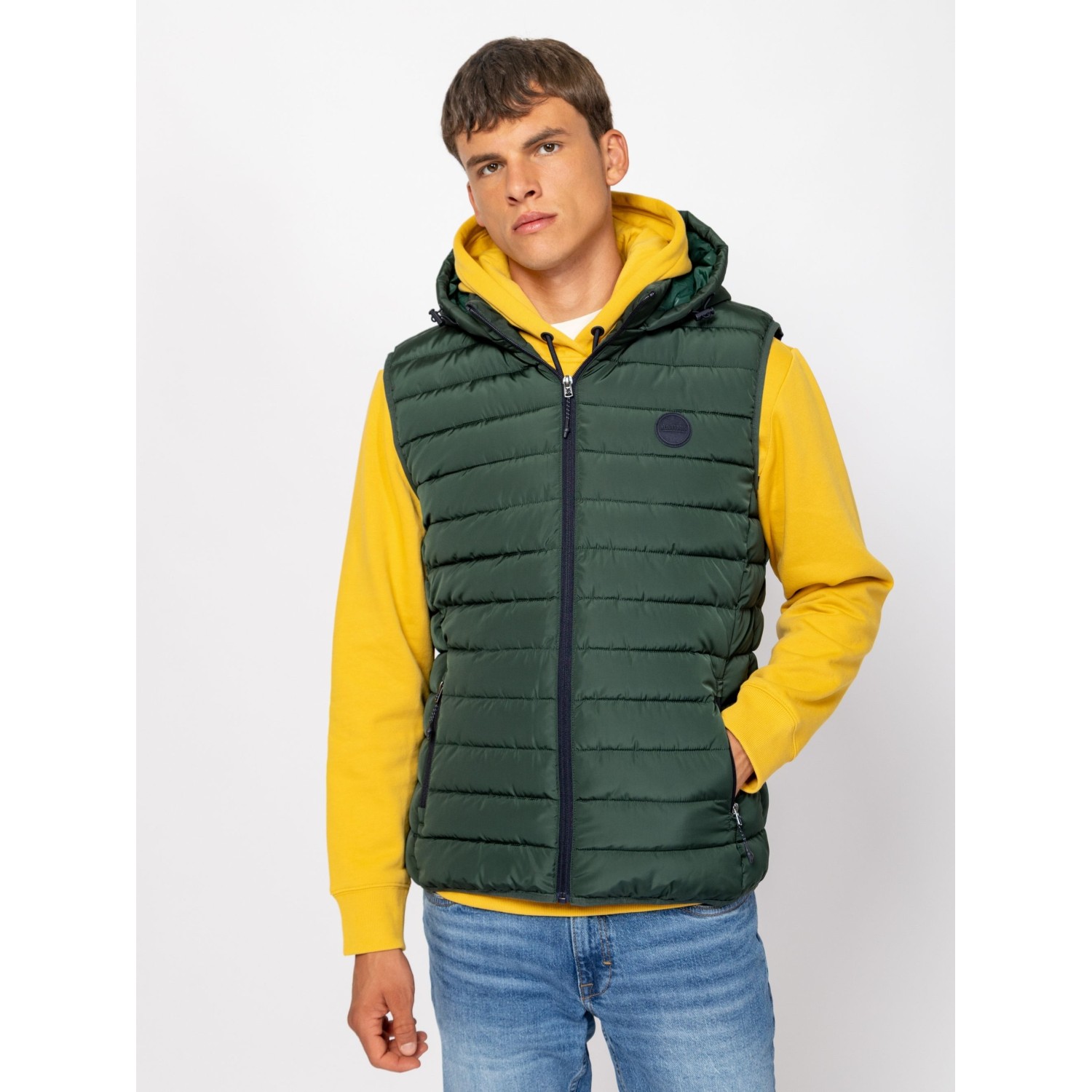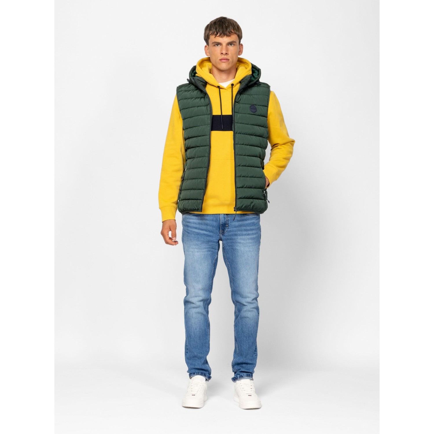 Férfi steppelt, kapucnis mellény, kényelmes szabással, állítható és levehető kapucnival, szabásvonalba helyezett, cipzáros zsebekkel, belső zsebbel és kis márkajelzéssel az elején. Anyaga: külső: 100% poliészter, bélés: 100% nylon, tömés: 100% poliészter. A modell 188 cm magas és L-es méretet visel.
