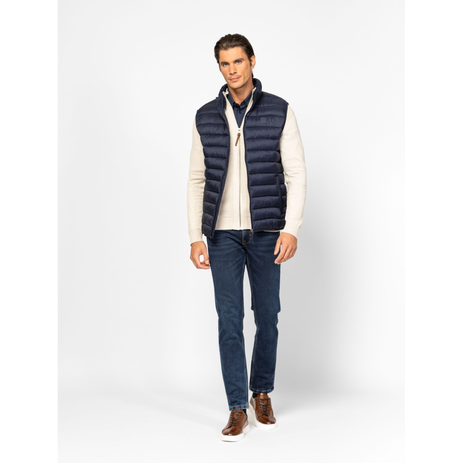 Férfi steppelt mellény, kényelmes szabással, állógallérral, cipzáros záródással, cipzáras zsebekkel, elején kis márkajelzéssel. Anyaga: külső, bélés: 100% nylon, tömés: 100% poliészter. A modell 188 cm magas és L-es méretet visel.