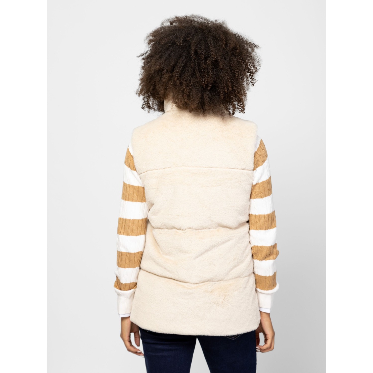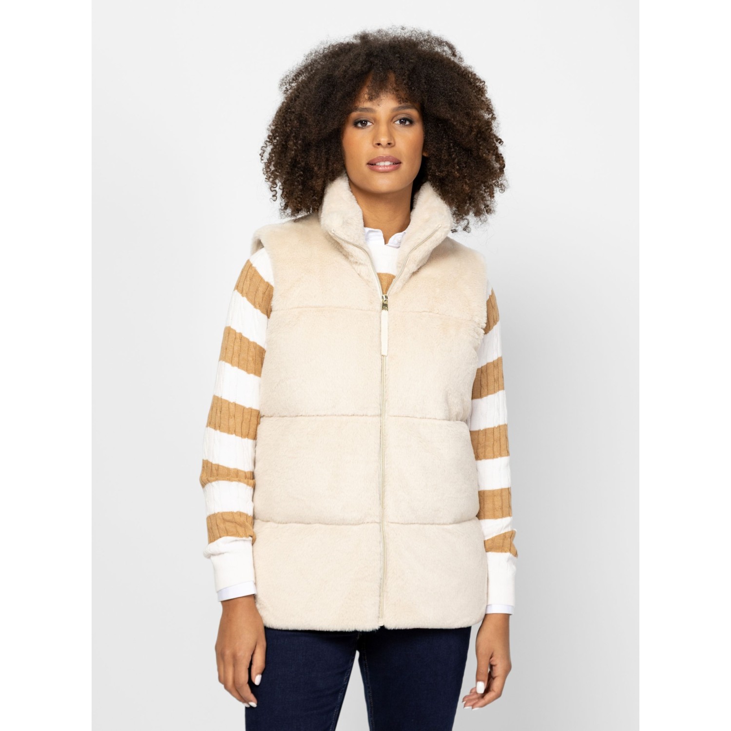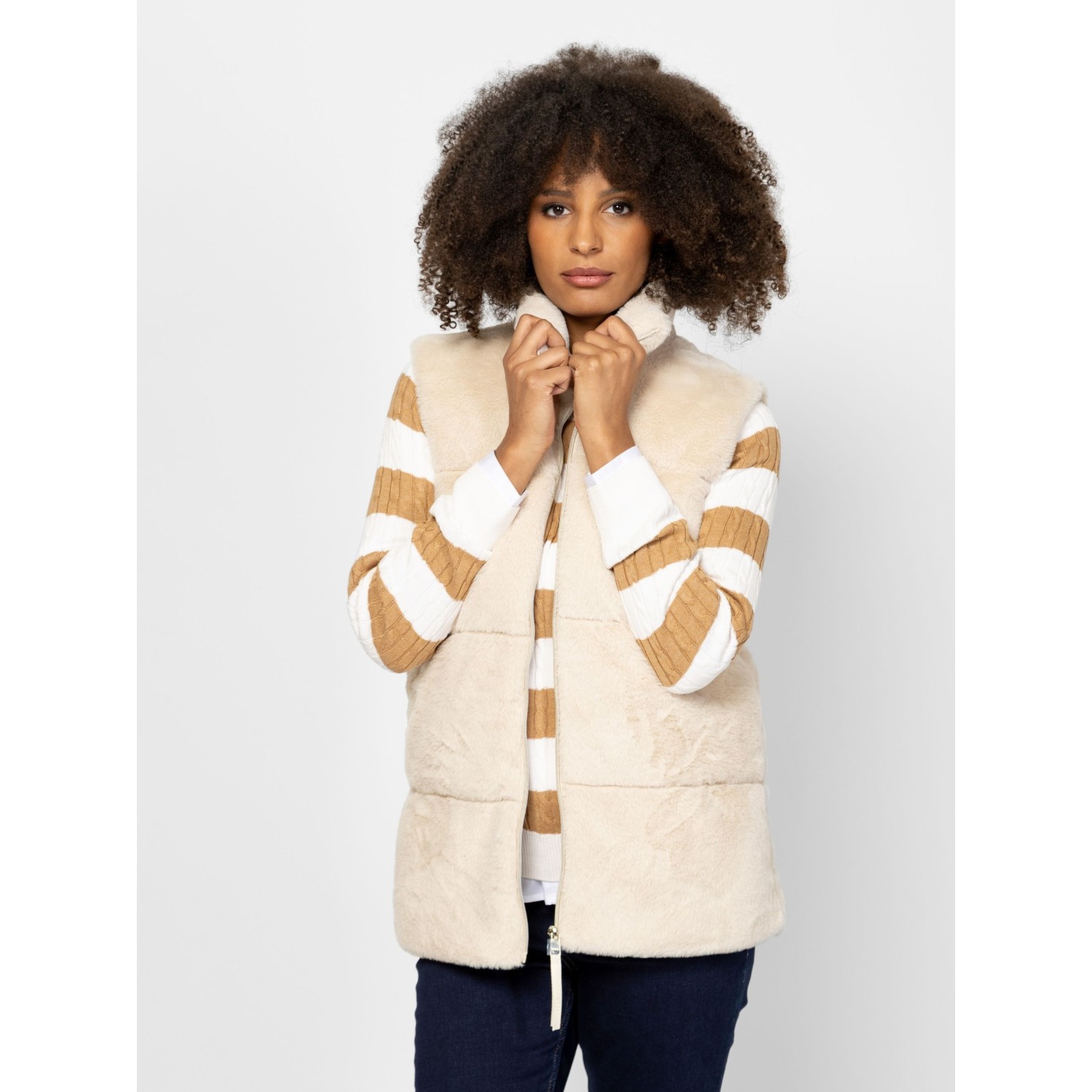 Női steppelt szőrme mellény, kényelmes szabással, ragyogó színekben, csípőig érő hosszal, álló gallérral, cipzáros záródással, logózott cipzárhúzóval. Anyaga: külső: 100% poliészter, bélés: 100% nylon, tömés: 100% poliészter. A modell 175 cm magas és S-es méretet visel.