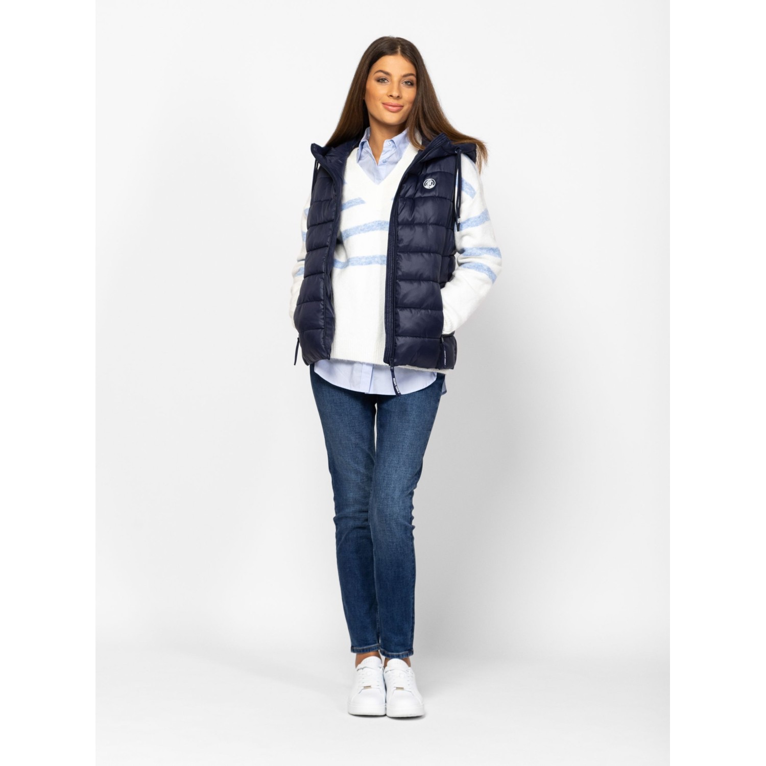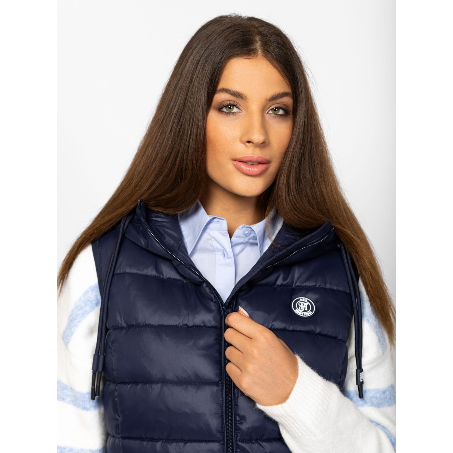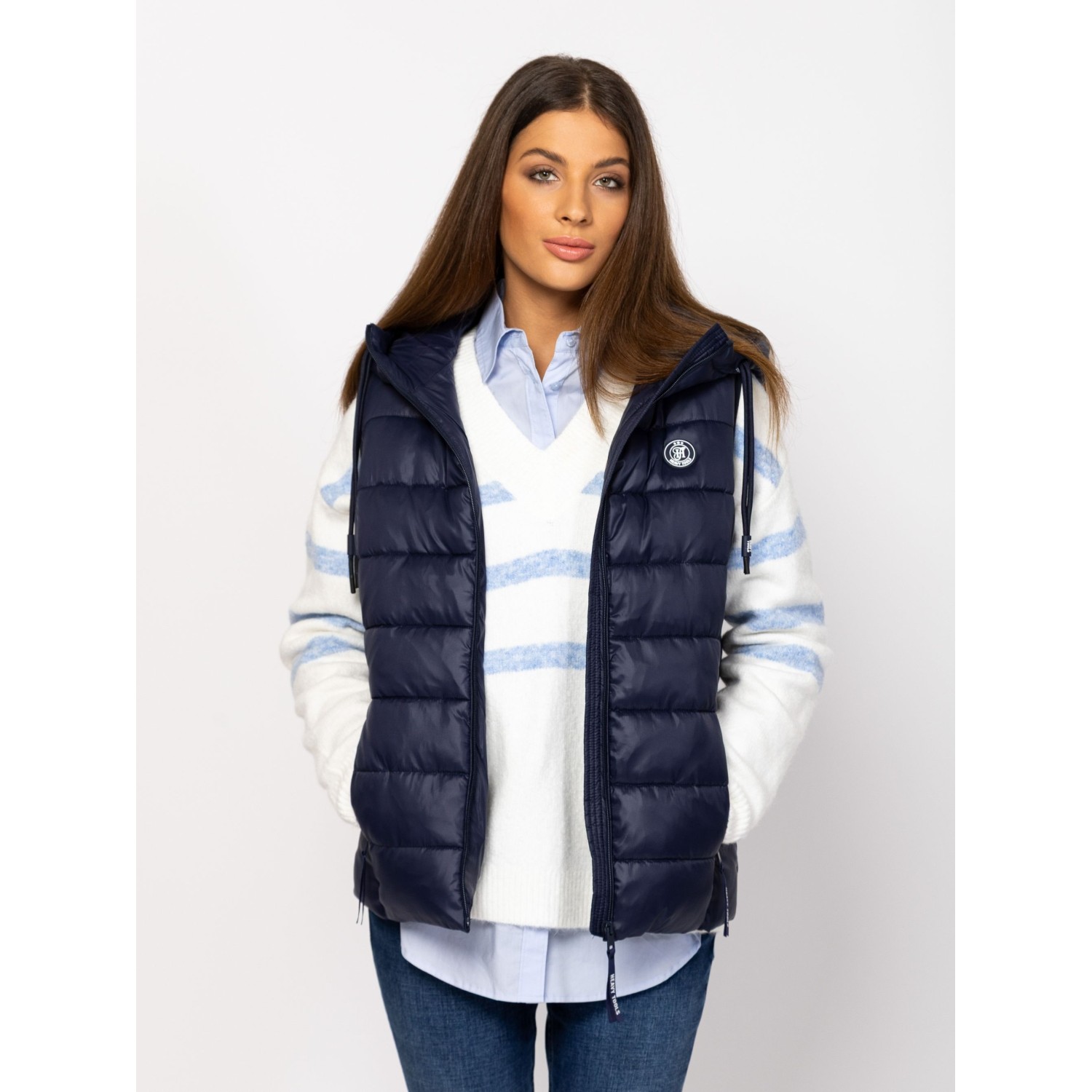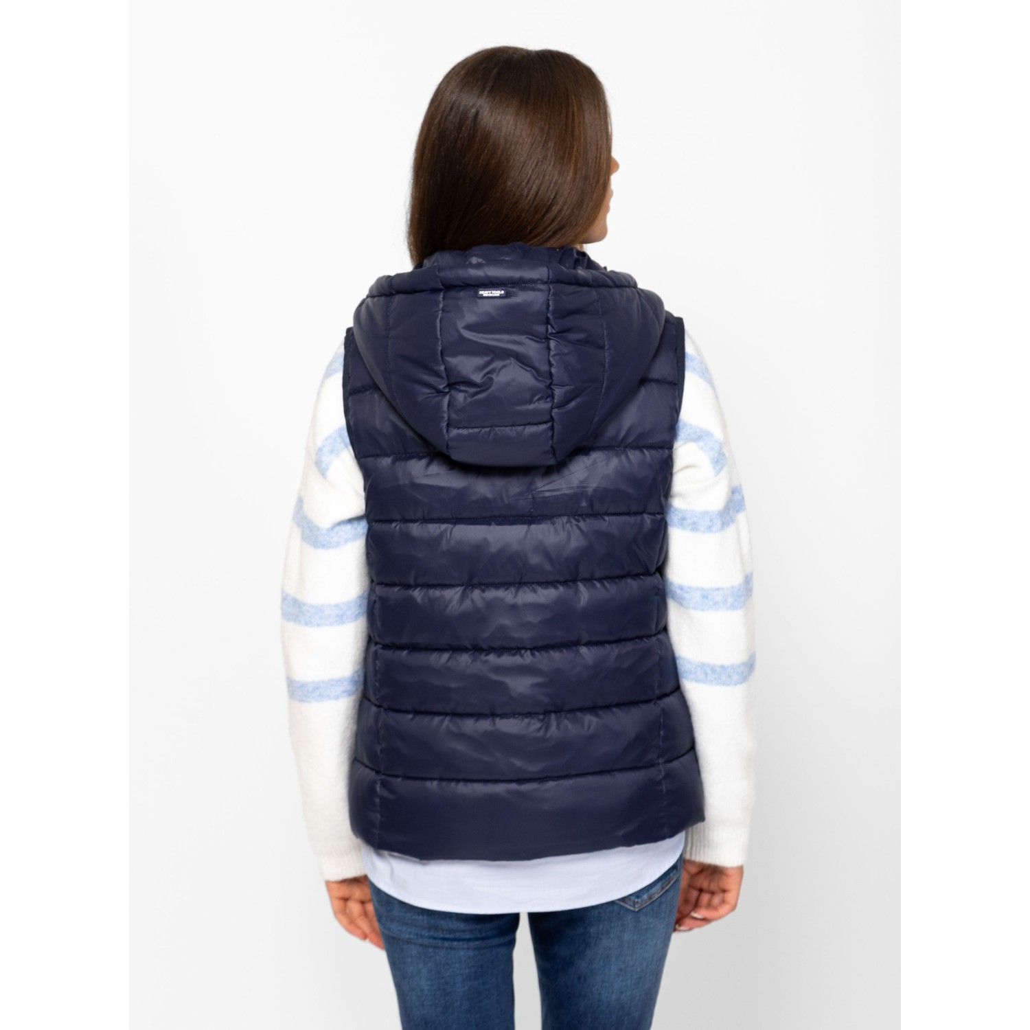 Női könnyű, steppelt mellény, kényelmes nőies szabással, állítható fix kapucnival, belső szélfogóval, szabásvonalba helyezett cipzáros zsebbel, kis márkajelzéssel az elején, a kapucnin és az oldalában. Anyaga: külső: 100% nylon, bélés: 100% poliészter, tömés: 100% poliészter, lightweight. A modell 175 cm magas és S-es méretet visel.
