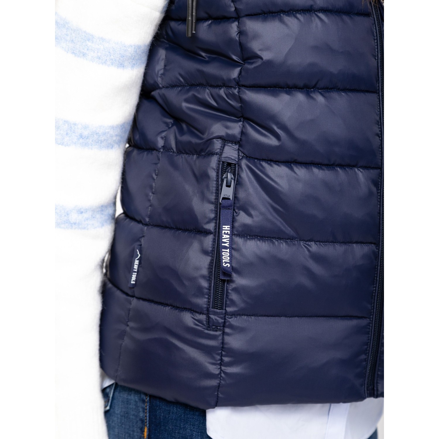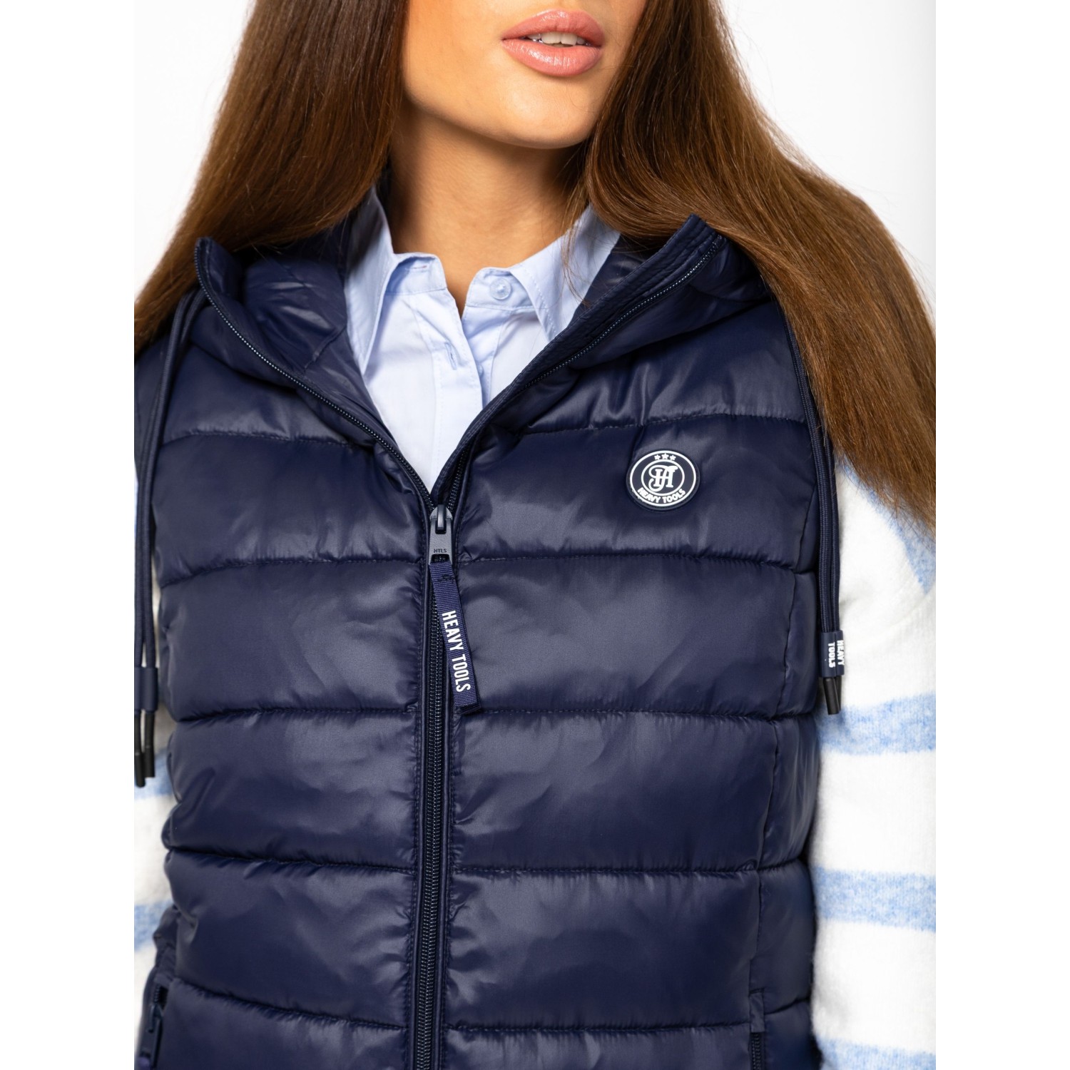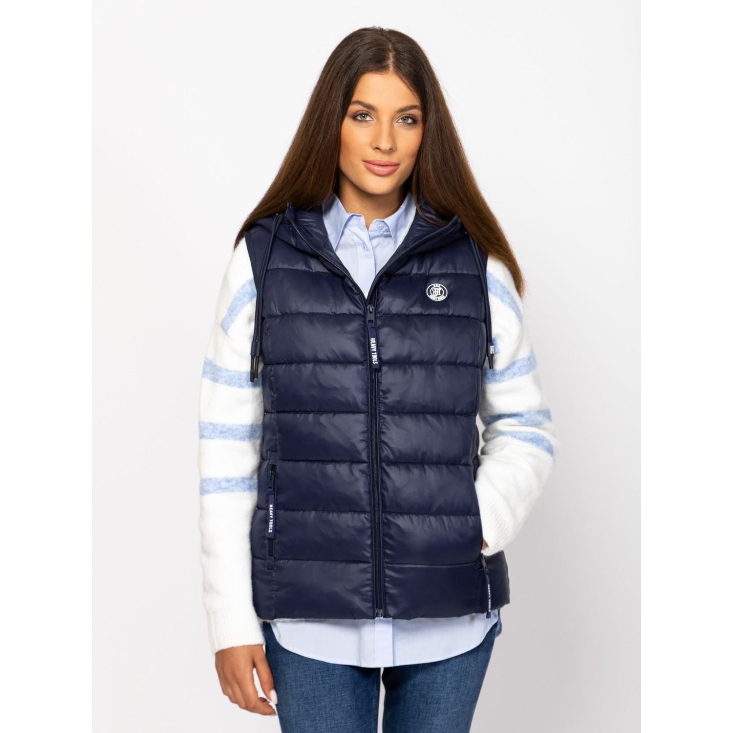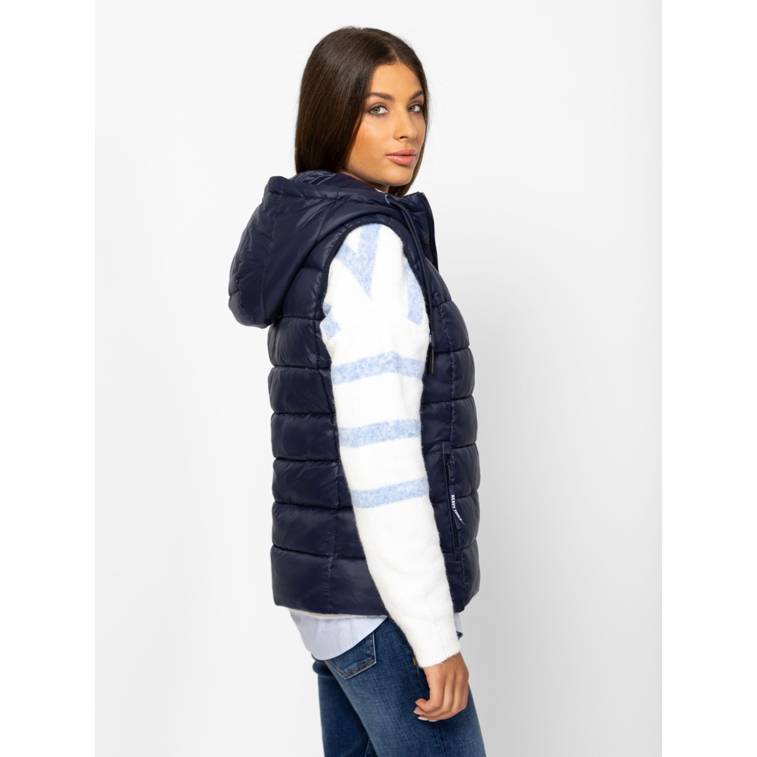Női könnyű, steppelt mellény, kényelmes nőies szabással, állítható fix kapucnival, belső szélfogóval, szabásvonalba helyezett cipzáros zsebbel, kis márkajelzéssel az elején, a kapucnin és az oldalában. Anyaga: külső: 100% nylon, bélés: 100% poliészter, tömés: 100% poliészter, lightweight. A modell 175 cm magas és S-es méretet visel.