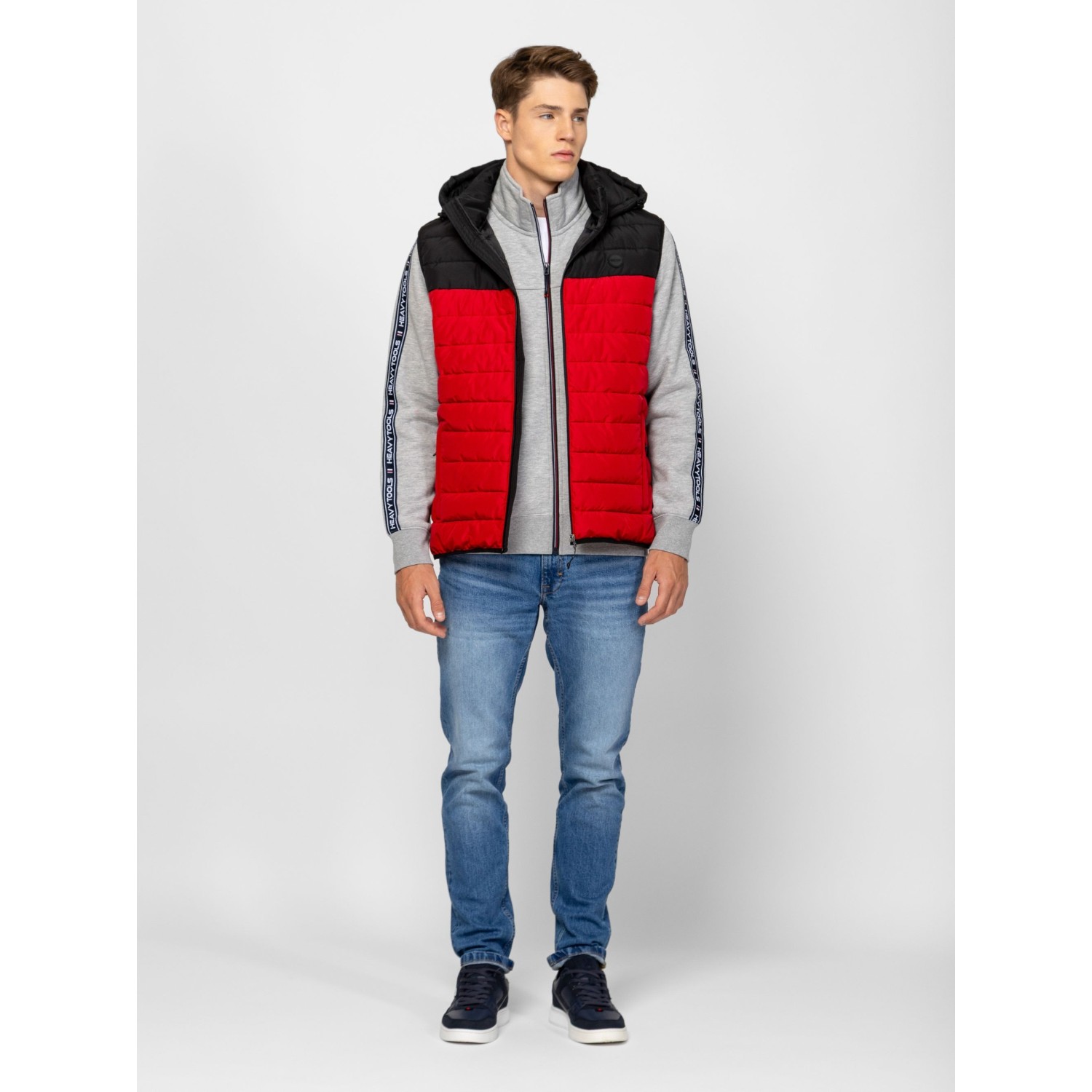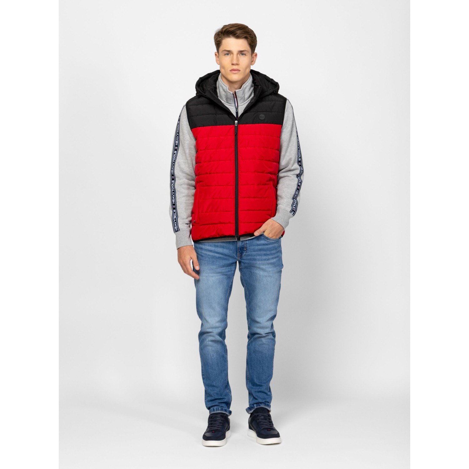 Férfi steppelt, kapucnis mellény, kényelmes szabással, sportos fazonnal, állítható és levehető kapucnival, cipzáros zsebekkel, belső szélfogóval, kis márkajelzéssel az elején. Anyaga: külső: 100% poliészter, bélés: 100% poliészter, tömés: 100% poliészter. A modell 188 cm magas és L-es méretet visel.