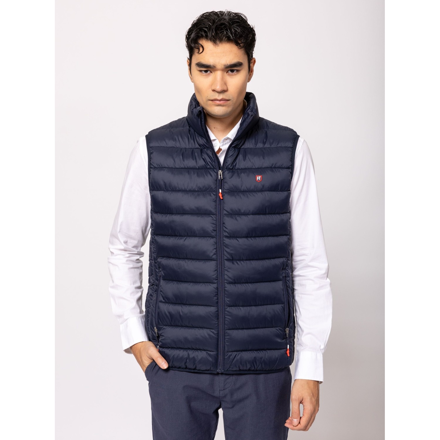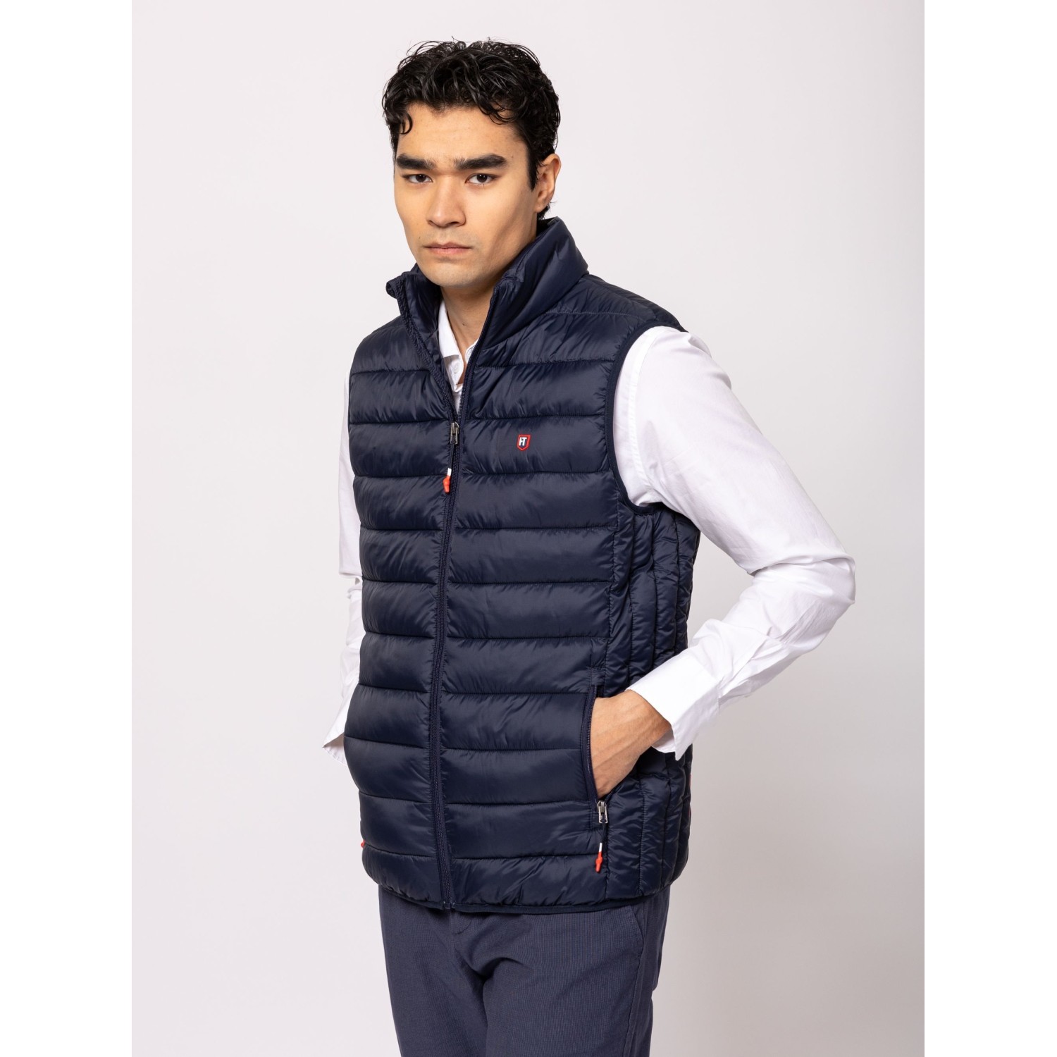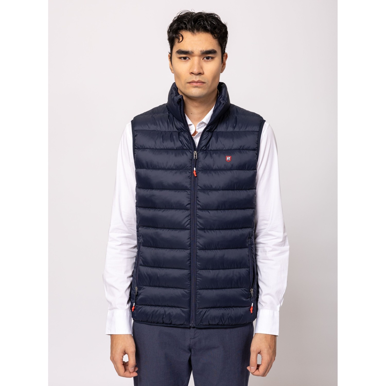 Férfi steppelt mellény, cipzáros záródással, kényelmes szabással, állógallérral, cipzáras zsebekkel, elején és hátán kis márkajelzéssel. Anyaga: külső: 100% nylon, bélés: 100% poliészter, tömés: 100% poliészter. A modell 188 cm magas és L-es méretet visel.