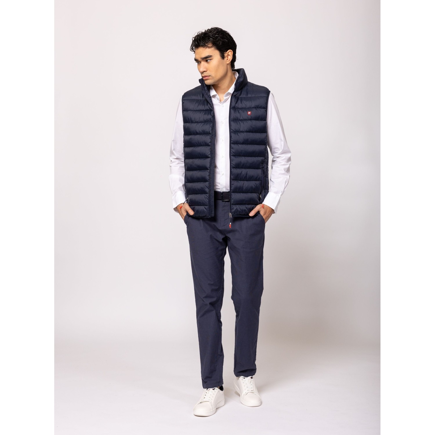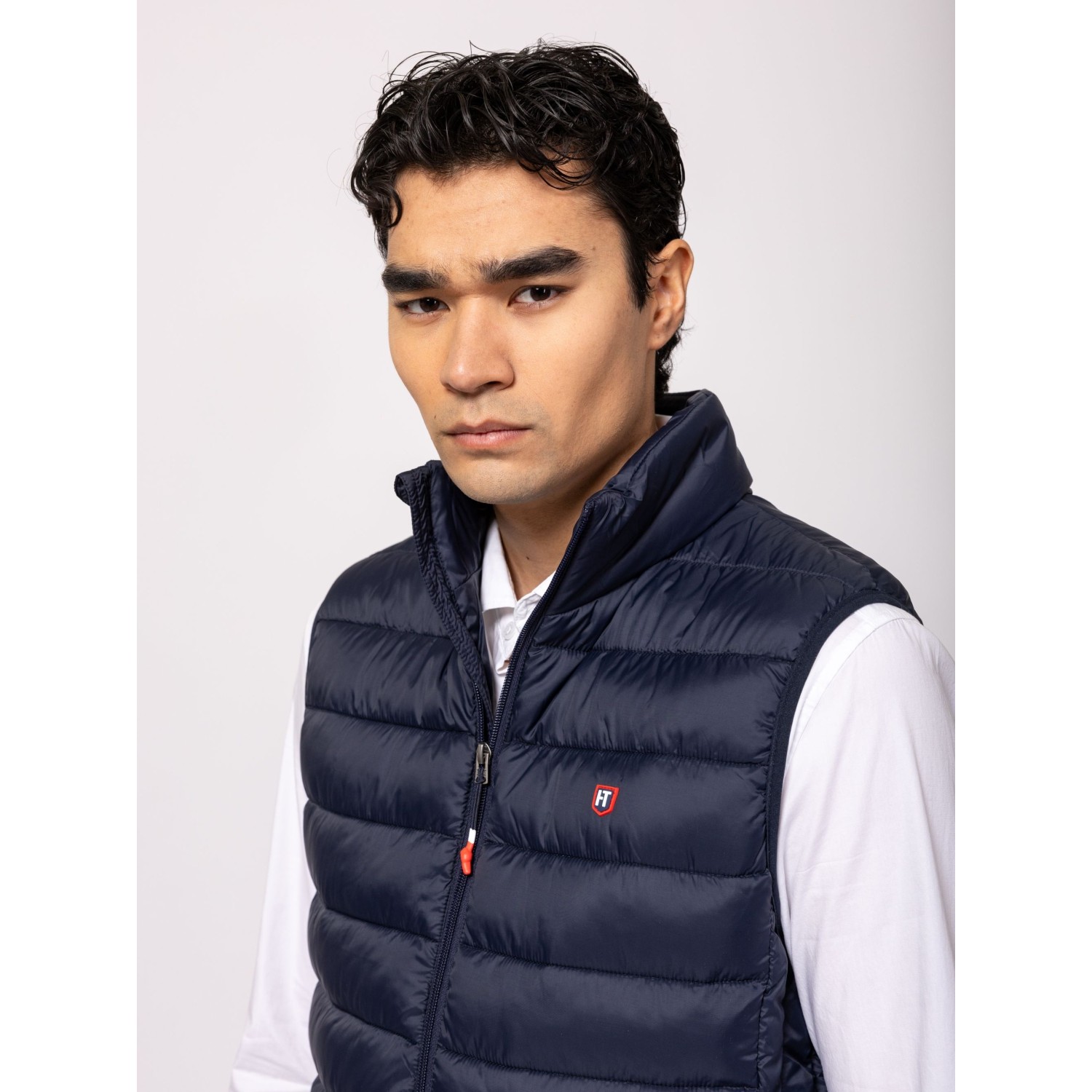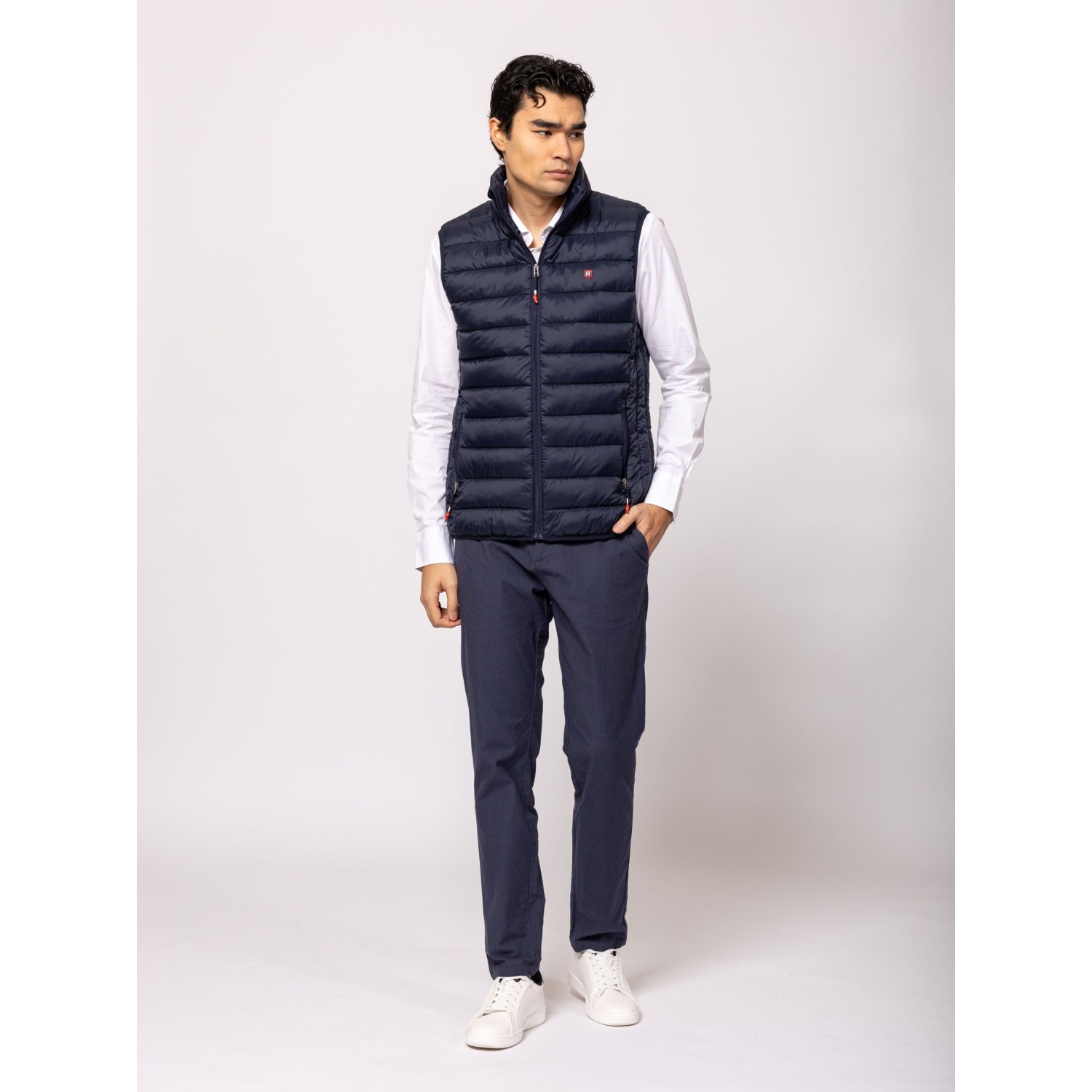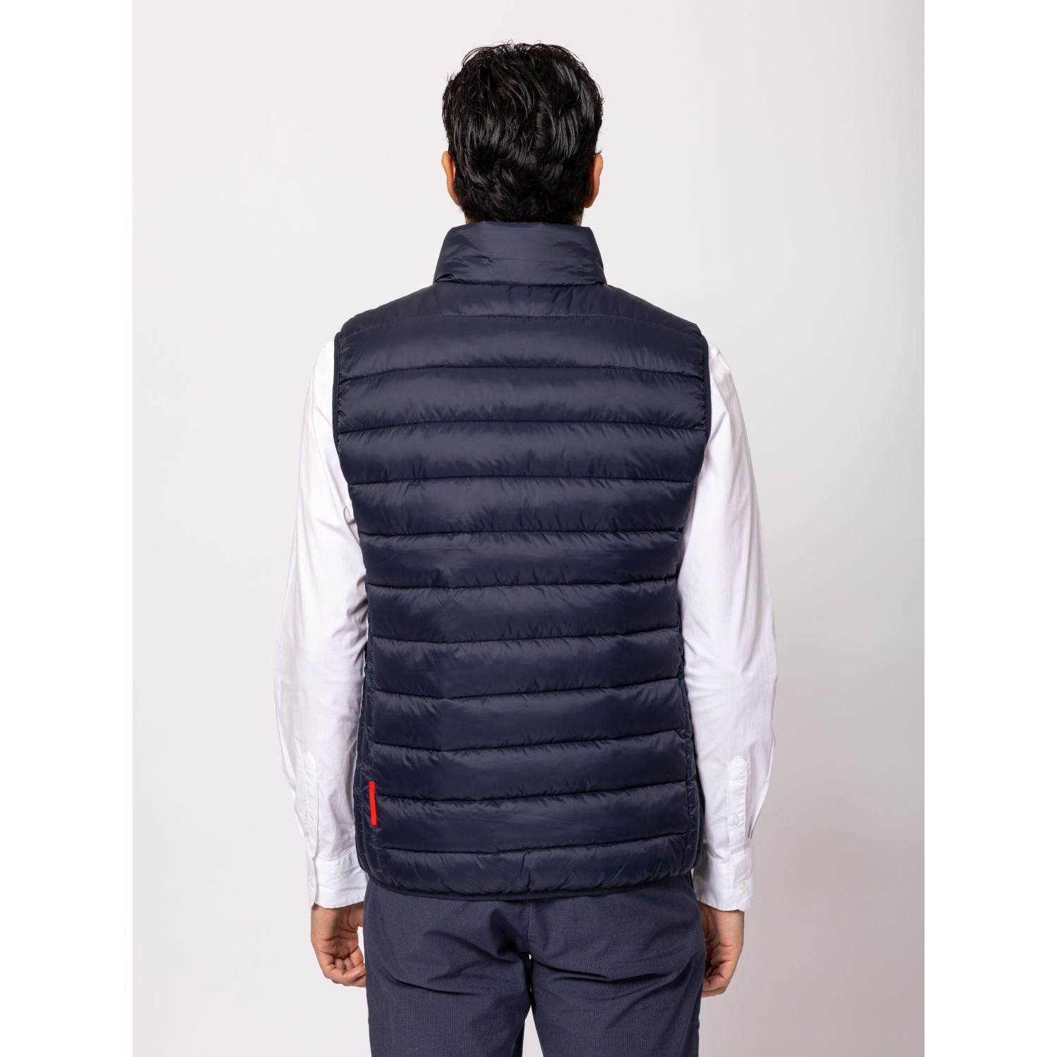 Férfi steppelt mellény, cipzáros záródással, kényelmes szabással, állógallérral, cipzáras zsebekkel, elején és hátán kis márkajelzéssel. Anyaga: külső: 100% nylon, bélés: 100% poliészter, tömés: 100% poliészter. A modell 188 cm magas és L-es méretet visel.