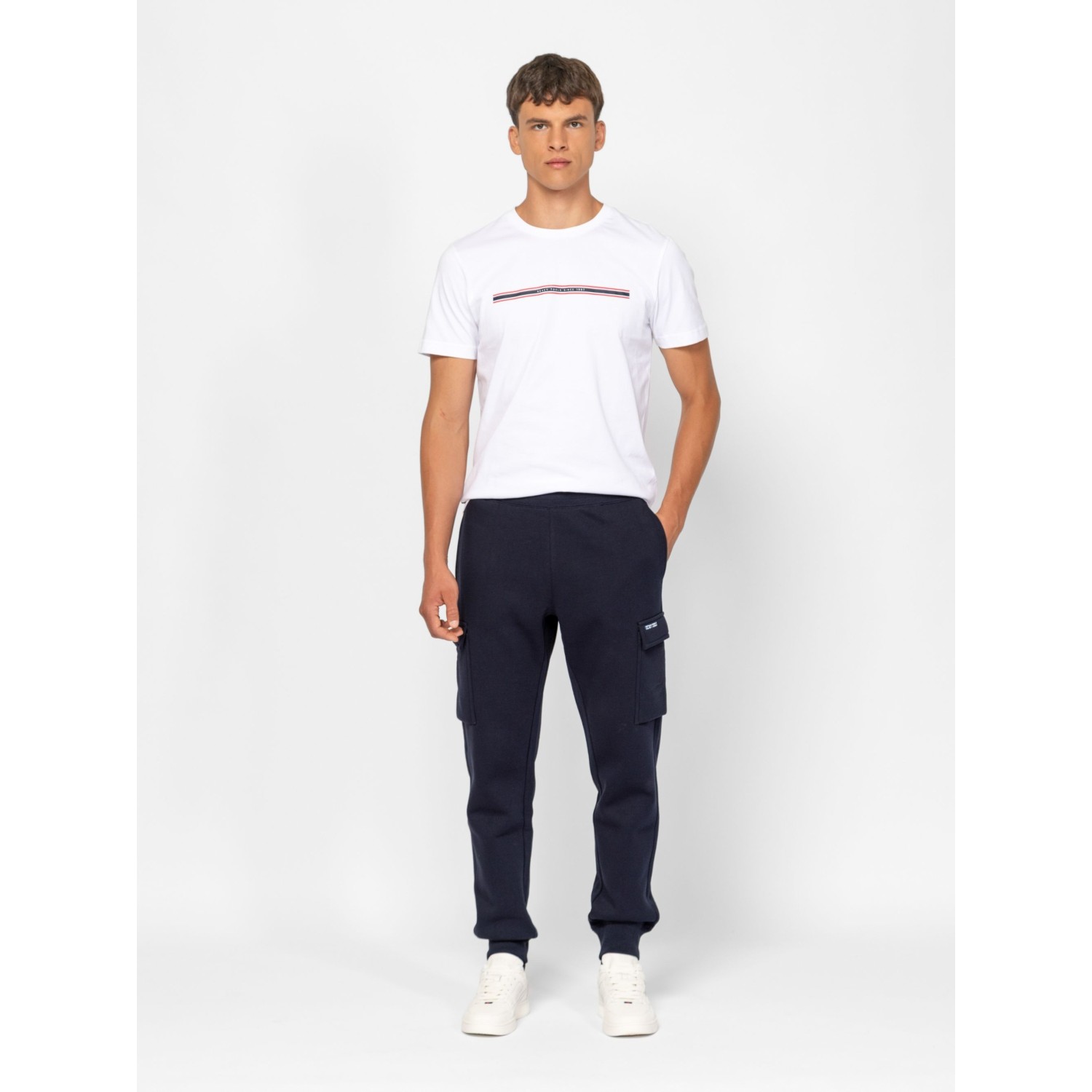 Férfi melegítőnadrág, kényelmes szabással, bordás passzéban végződő szárral, húzózsinórral állítható, elasztikus derékkal, oldalában zsebekkel, oldalán logózott dekor szalaggal, jól szellőző anyagból. Anyaga: 80% pamut, 20% poliészter, belül bolyhozott fleece. A modell 188 cm magas és M-es méretet visel.