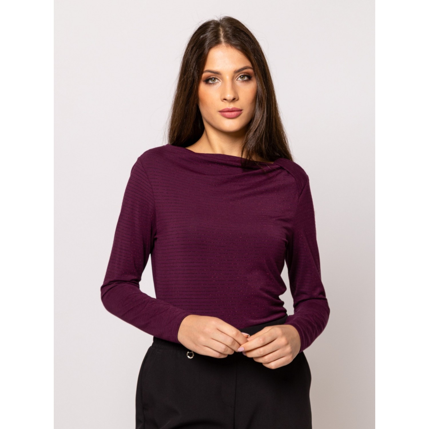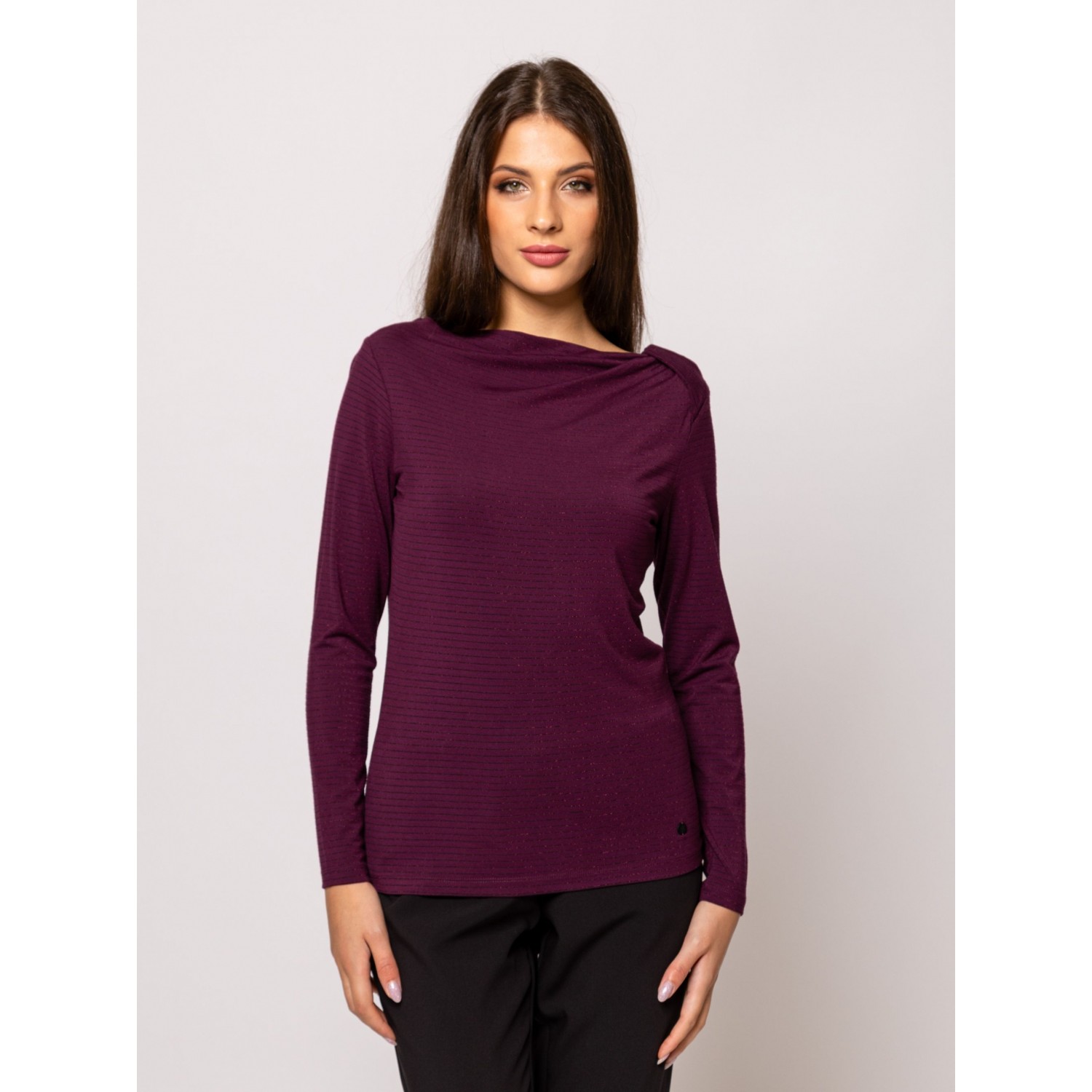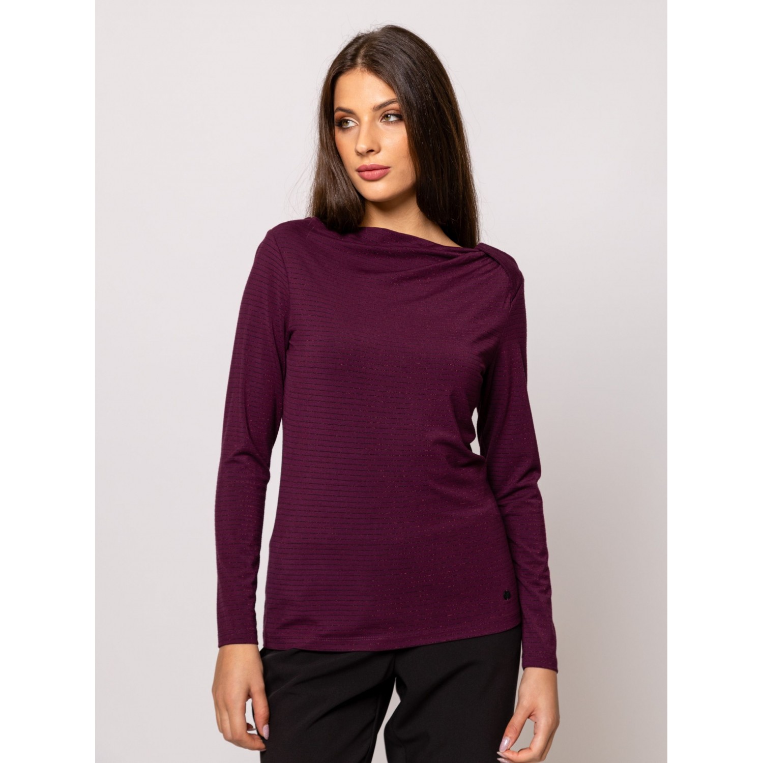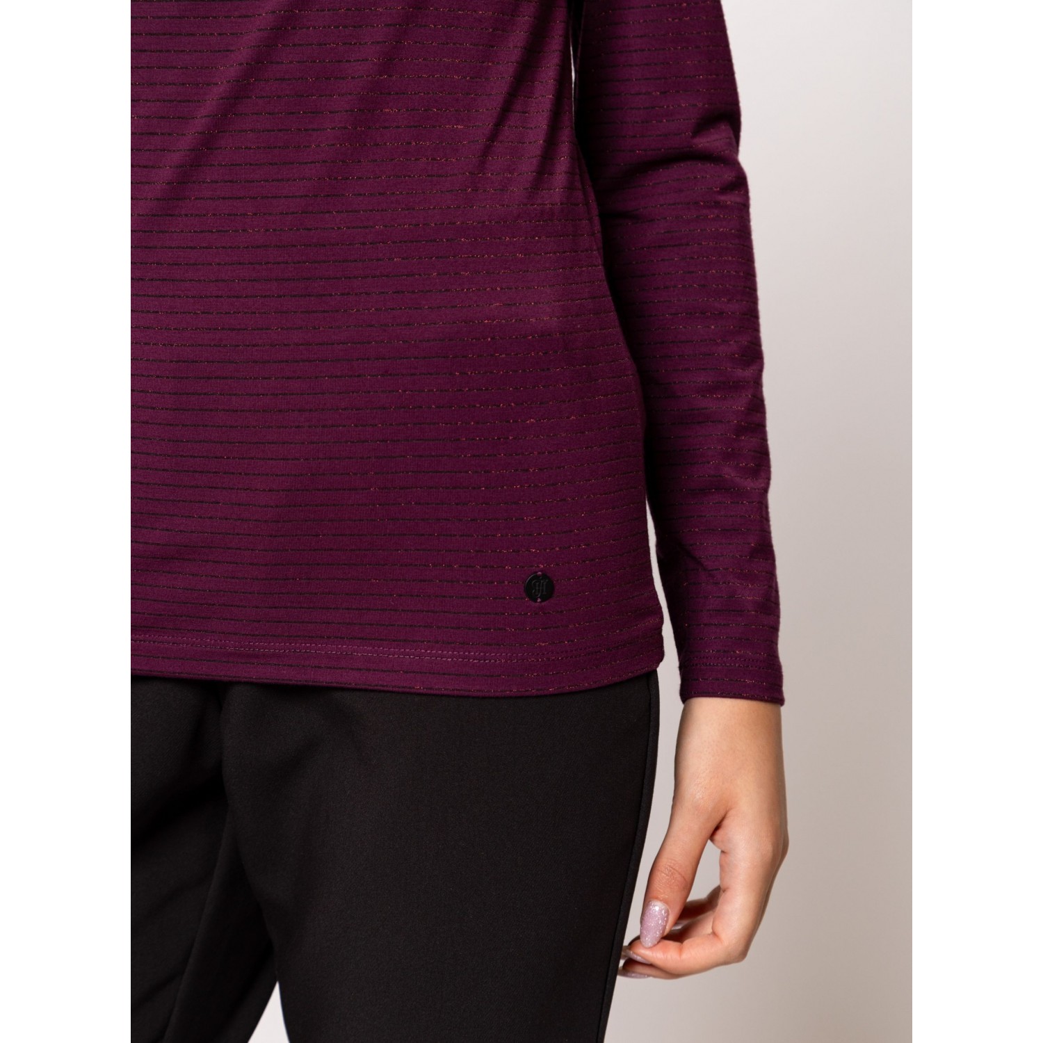 Női hosszú ujjú póló, testhezálló fazonnal, dekoratív nyakmegoldással, vékony, lurexes csíkozással, viszkóz keverék anyagból, kis fém márkajelzéssel az elején. Anyaga: 85% viszkóz, 8% elasztán, 5% nylon, 2% lurex. A modell 175 cm magas és S-es méretet visel.
