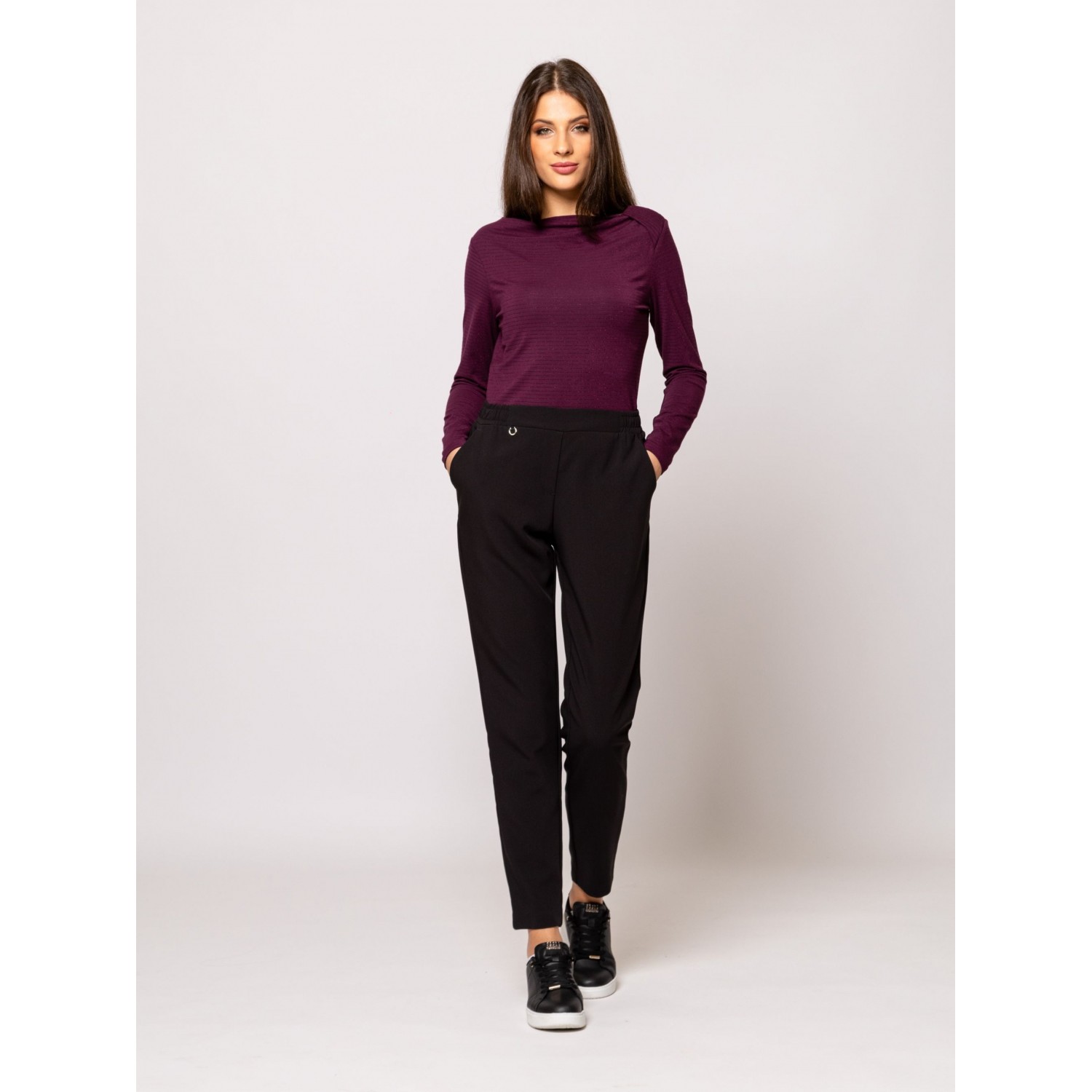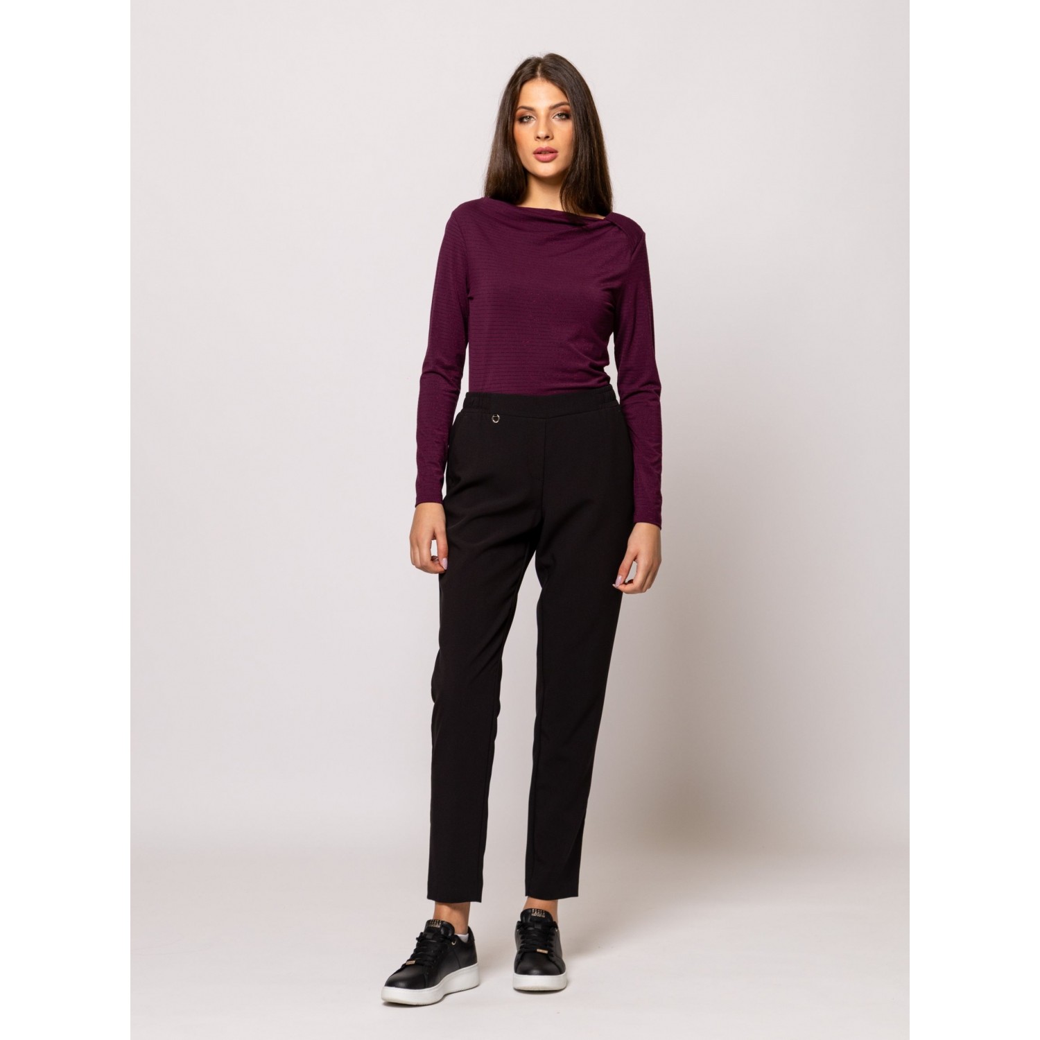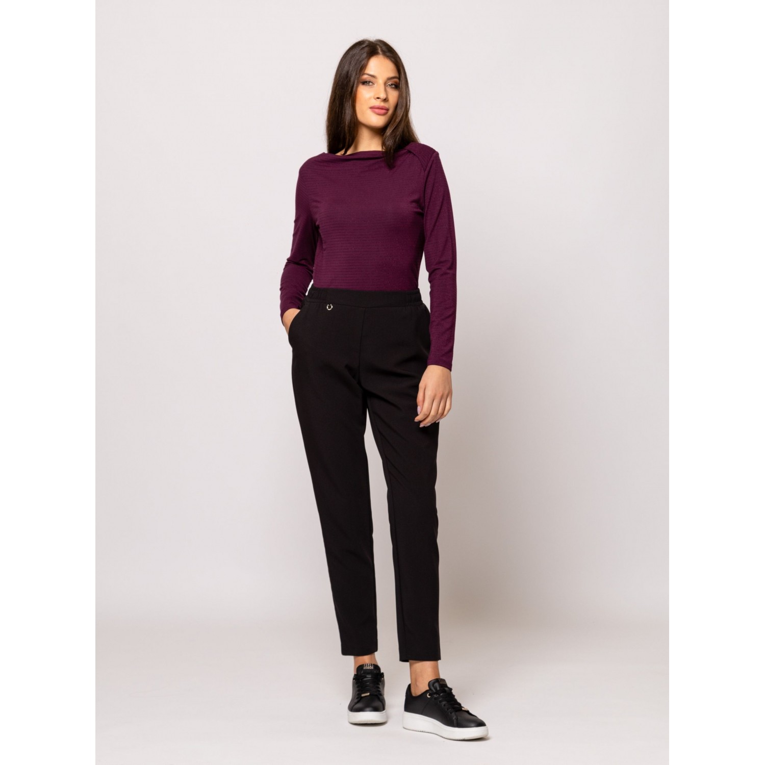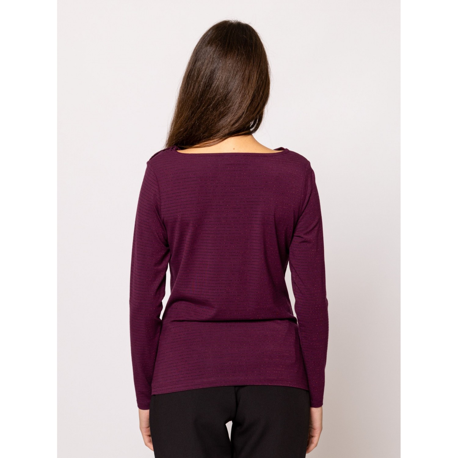 Női hosszú ujjú póló, testhezálló fazonnal, dekoratív nyakmegoldással, vékony, lurexes csíkozással, viszkóz keverék anyagból, kis fém márkajelzéssel az elején. Anyaga: 85% viszkóz, 8% elasztán, 5% nylon, 2% lurex. A modell 175 cm magas és S-es méretet visel.