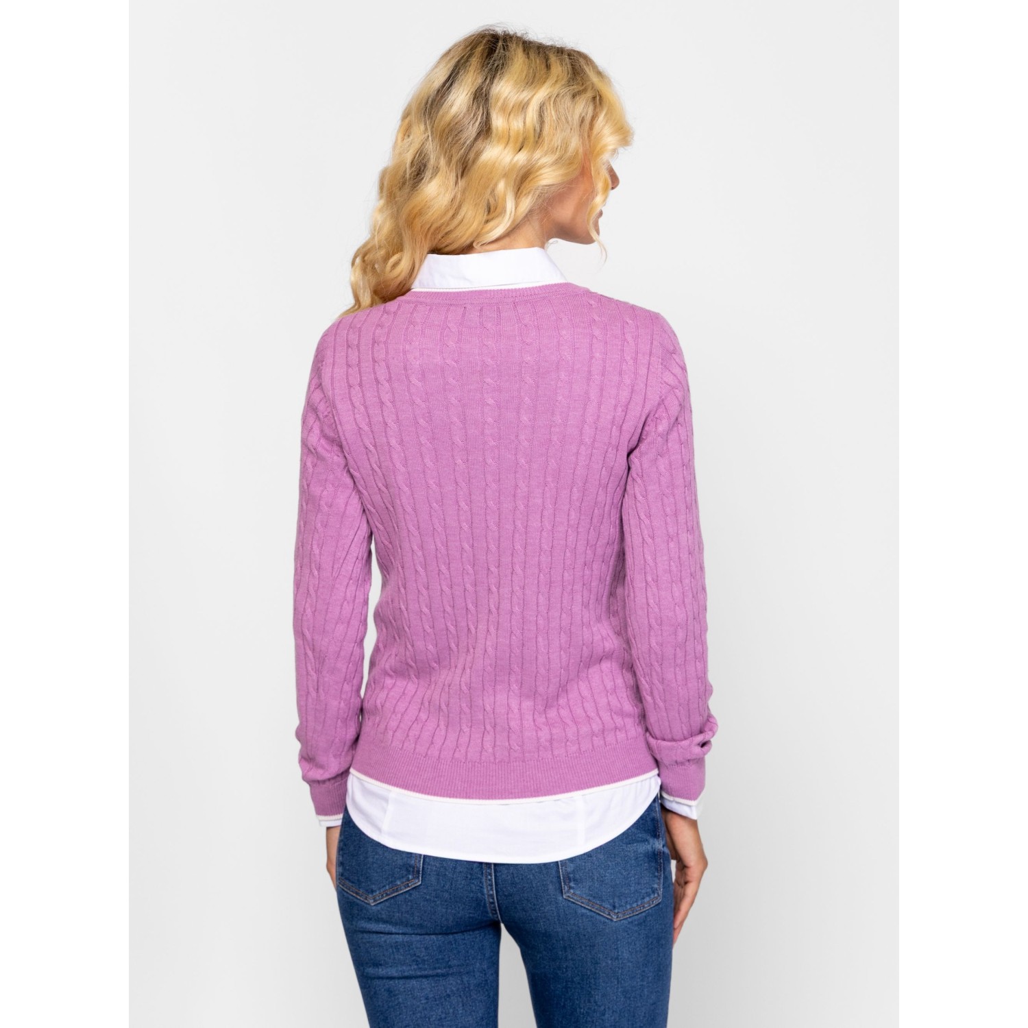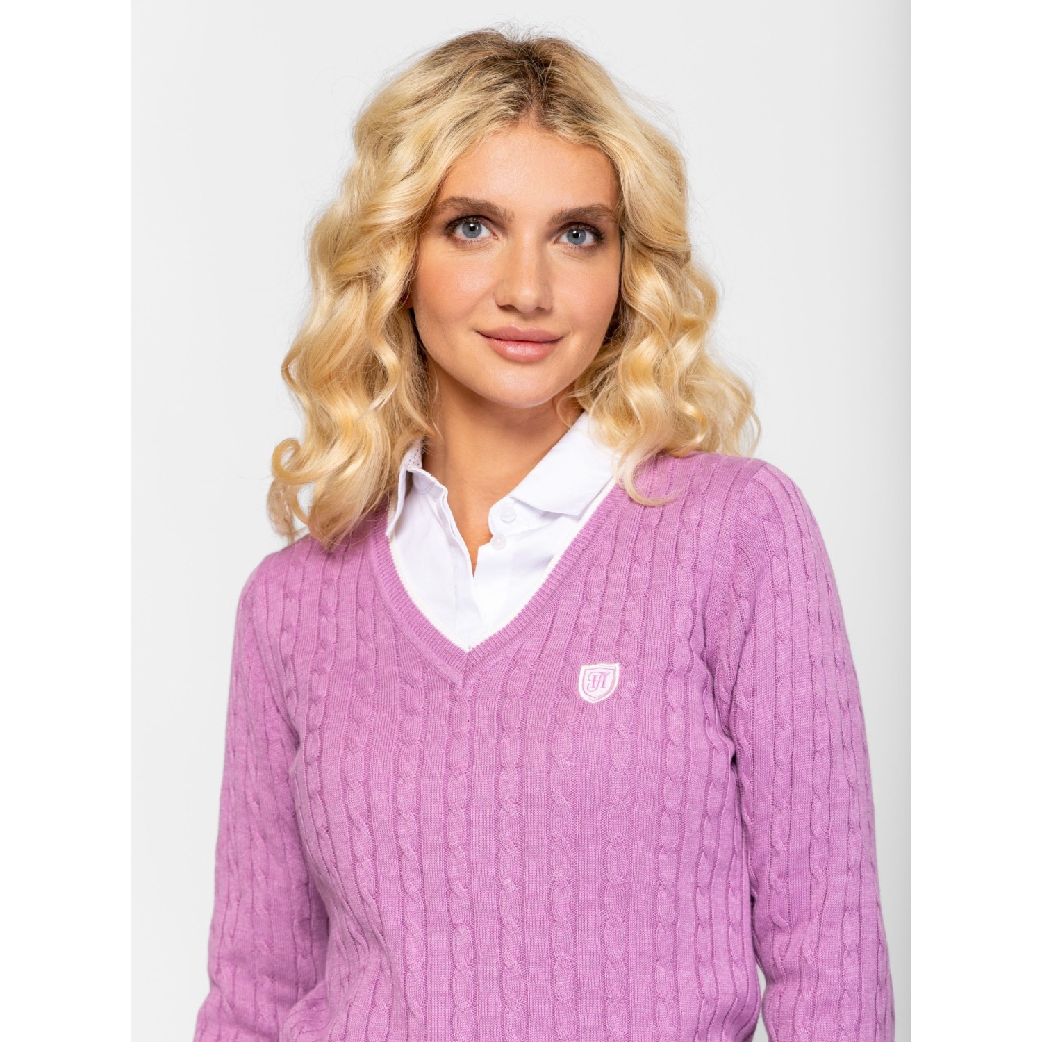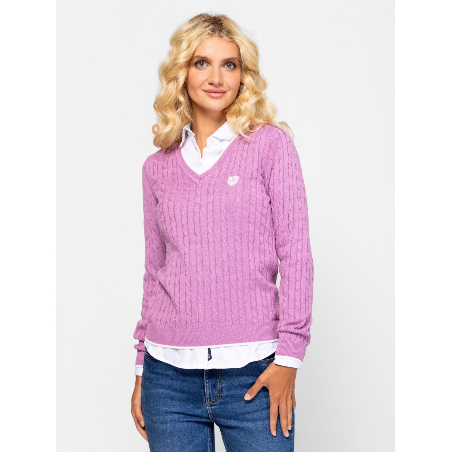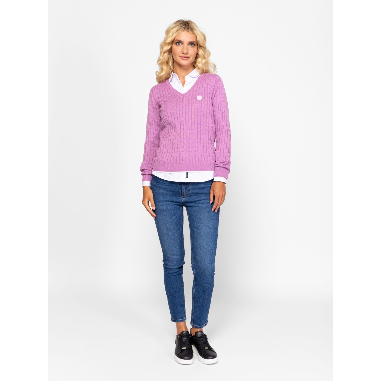 Női kötött pulóver, klasszikus szabással, v-nyakkal, csavart kötésmintával, kis szövött márkajelzéssel az elején. Anyaga: 55% akril, 45% pamut, kötött anyag. A modell 175 cm magas és S-es méretet visel.